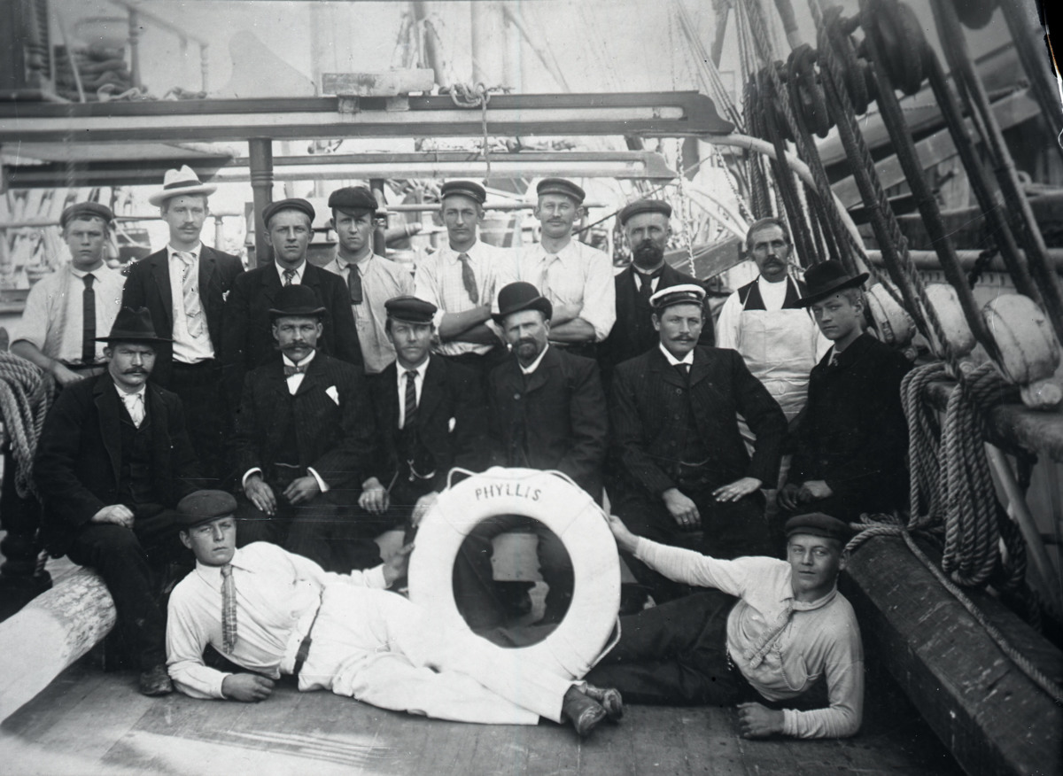 Besättningen på barken PHYLLIS av Larvik, 1904 i Port Natal. Följande personer finns med på bilden; 1. Kapten Gabrielsen, Larvik 2. 1:e styrman G. Larsen, Larvik 3. 2:e styrman G. Gundersen, Larvik 4. Timmerman Ch. Christiansen, Larvik 5. Sgelmakare M. Tapio, Viborg 6. Matros Otto Wesberg, Visby 7. Matros John Ericsen, Visby 8. Matros Sven Olsen, Larvik 9. Matros Johan Jensen, Larvik 10 Lättmatros Einar Borgstedt, Gbg 11. Lättmatros Engvald Engelstad 12 Jungman, Olof Traung,Upsala 13 Jungman, FredrikAdelborg, Sthlm 14.Jungman Axel jansson, Onsala 15 Däckspojk, Karl Gustaf Lindahl, Arvika 16 Stewart Hans Henriksen, Larvik