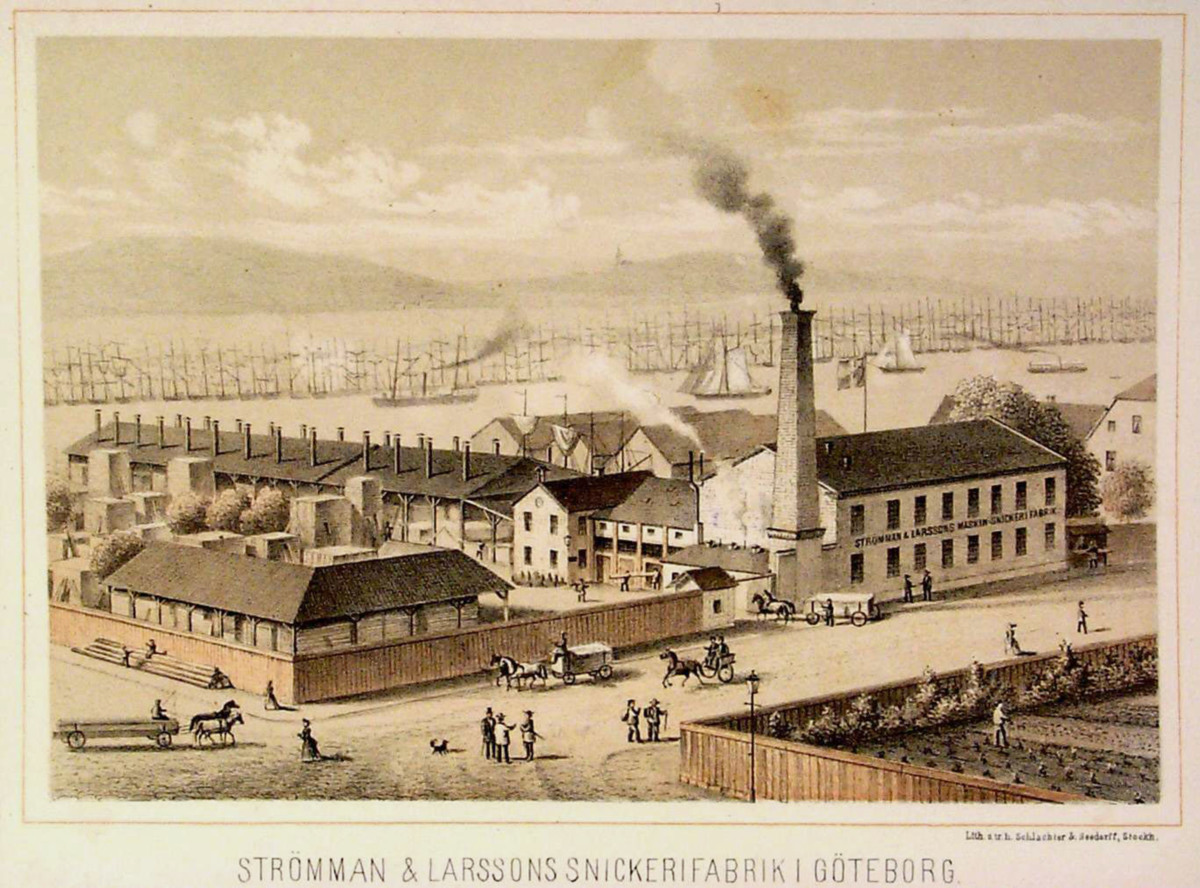 Illustration, motiv är Strömman & Larssons Snickerifabrik i förgrunden. I bakgrunden syns en lång rad segelfartyg liggande för ankar. Framför segelfartygen syns ett par ångbåtar och segelfartyg under gång.