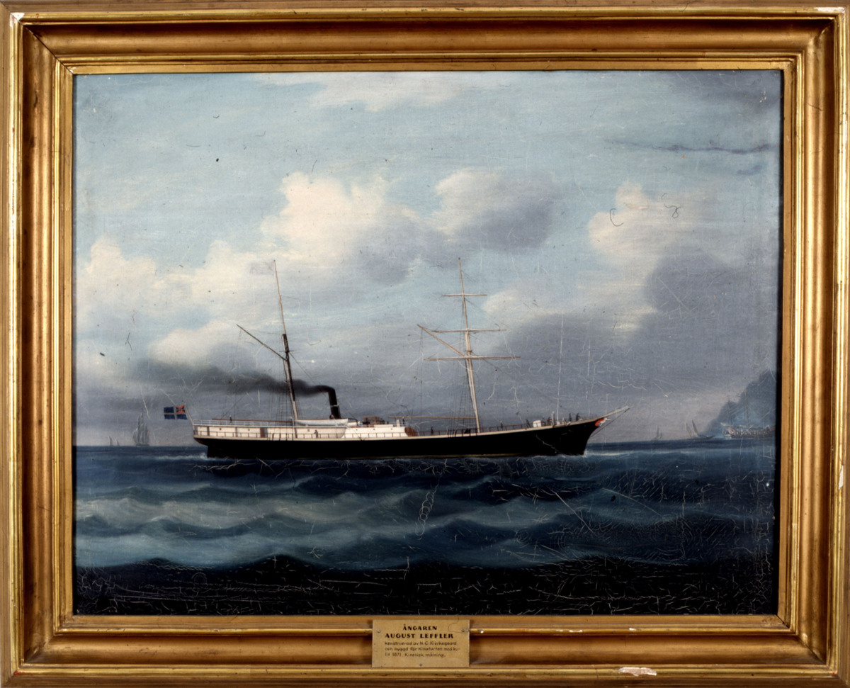 Ångaren AUGUST LEFFLER var byggd av ek. Befälhavare: Kapten J F Björck. Fartyget brann upp i Cettes hamn 1886. Målad av okänd kinesisk konstnär.