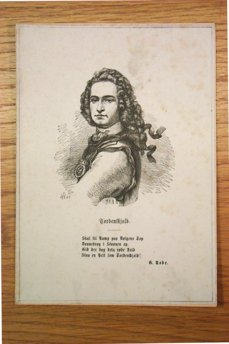 Text under porträttet: Tordenskjold. Skal til Kamp paa Bölgens Top Dannebrog i Stavnen op, Gid der bag dets röde Fold Staa en helt som Tordenskjold! G. Rode