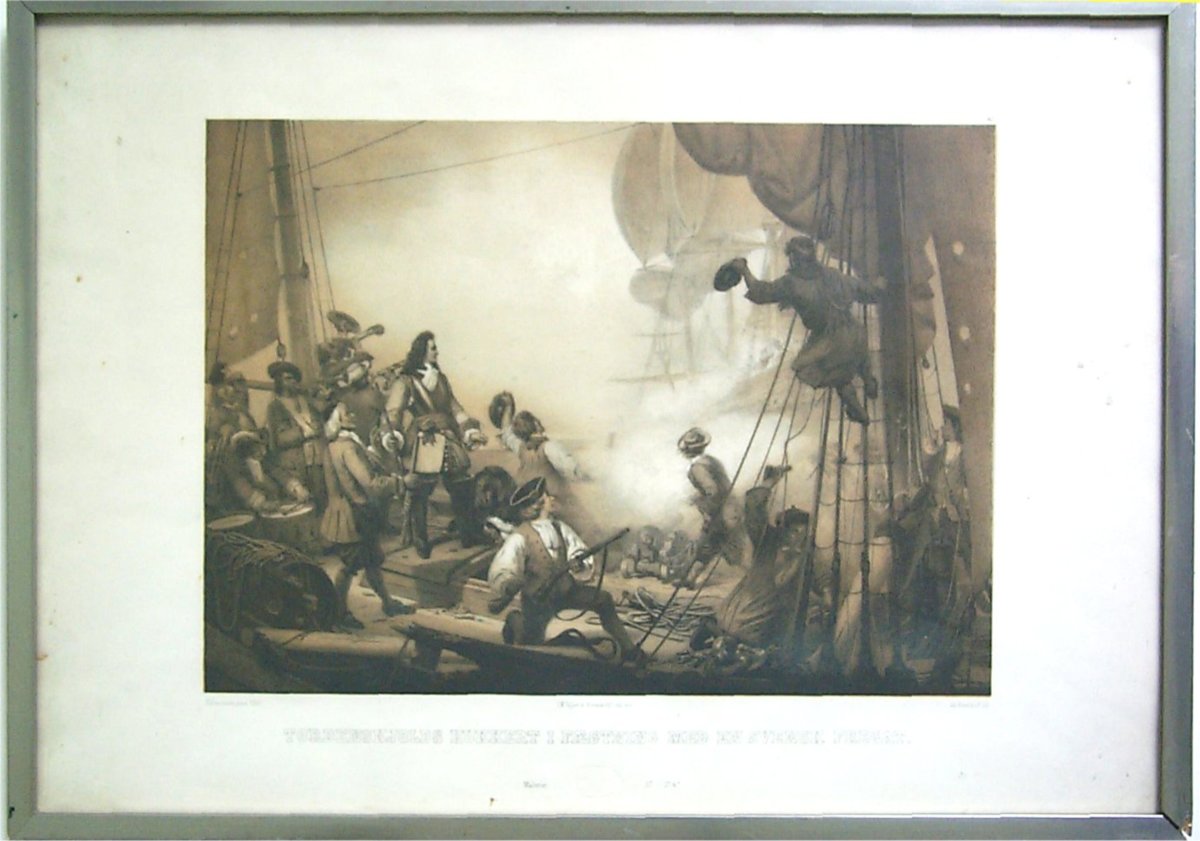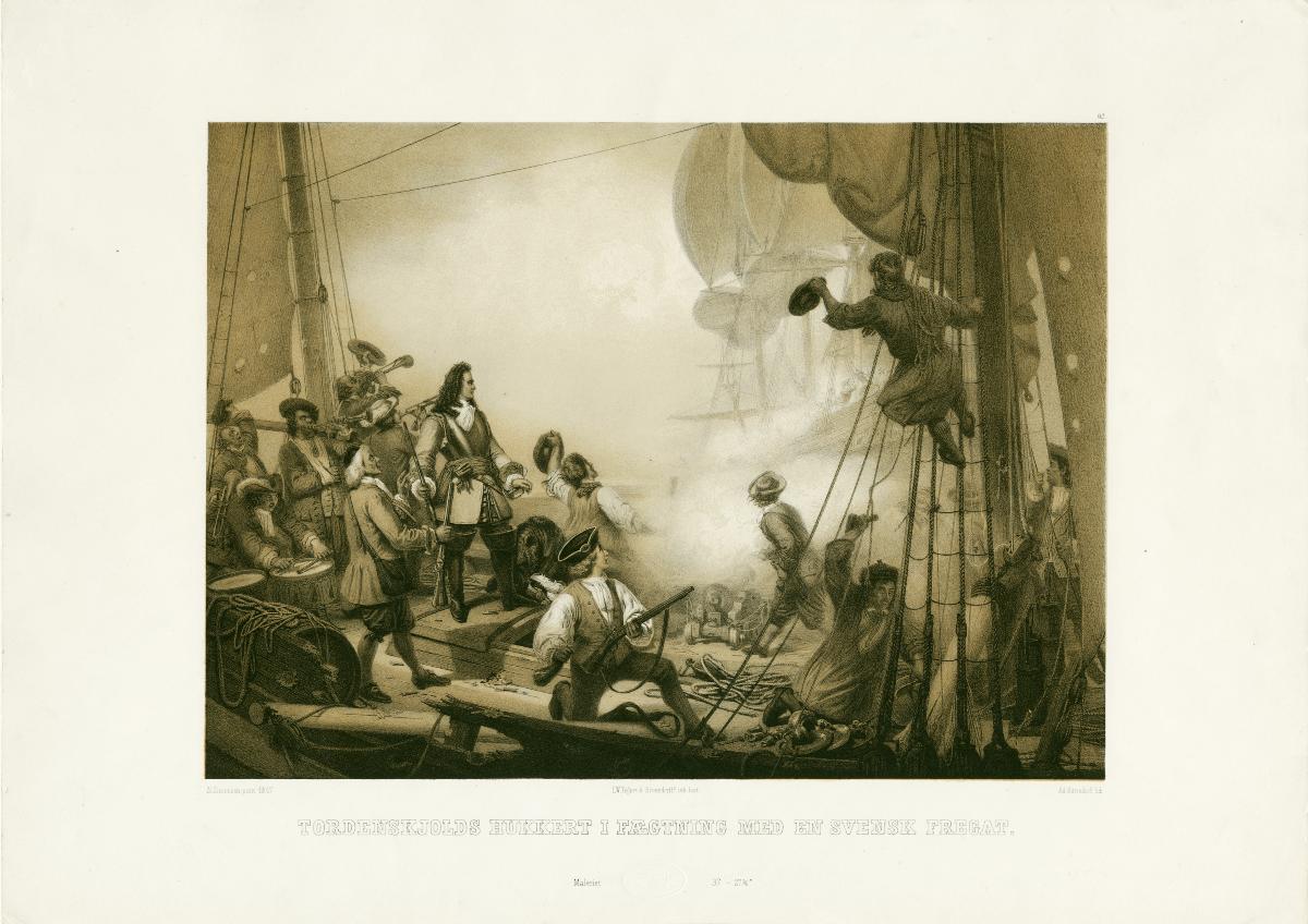 Litografi efter tavla målad av N. Simonsen 1847 föreställande Tordenskiöld i fäktning med en svensk fregatt.