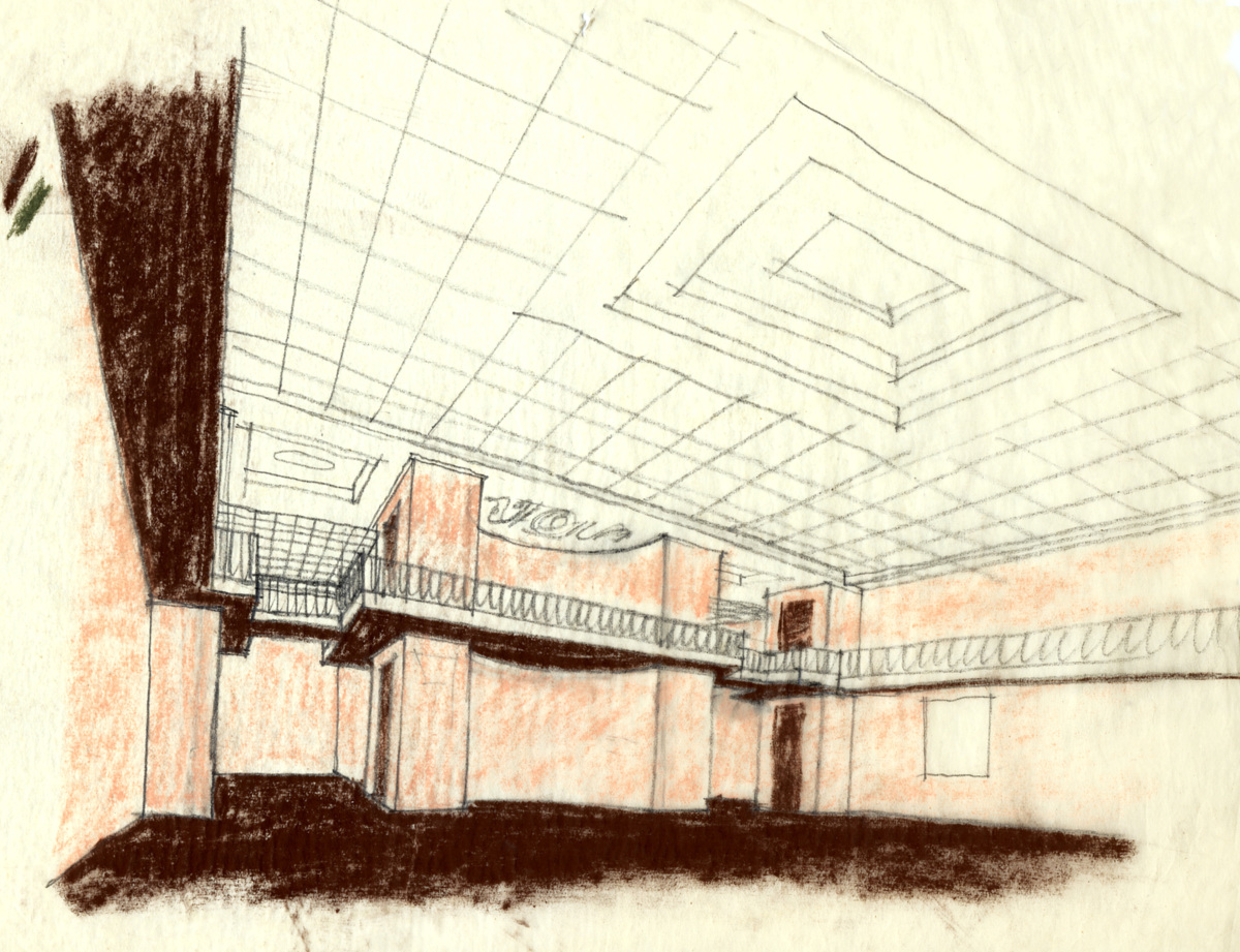 Interiörskiss, tak och balkong i musik- och sällskapsrum A-däck