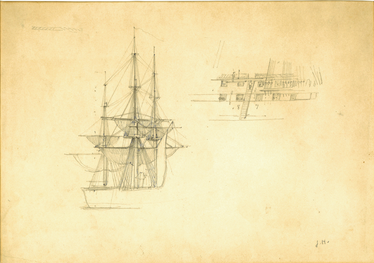 Blyertsteckning, detaljskisser av segelfartyg