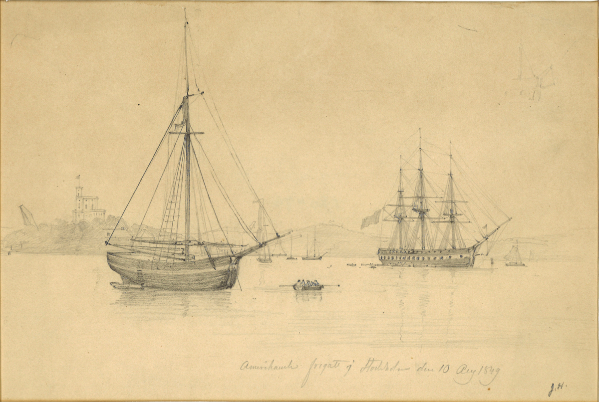 Blyertsteckning föreställande en amerikansk fregatt i Stockholm 1849