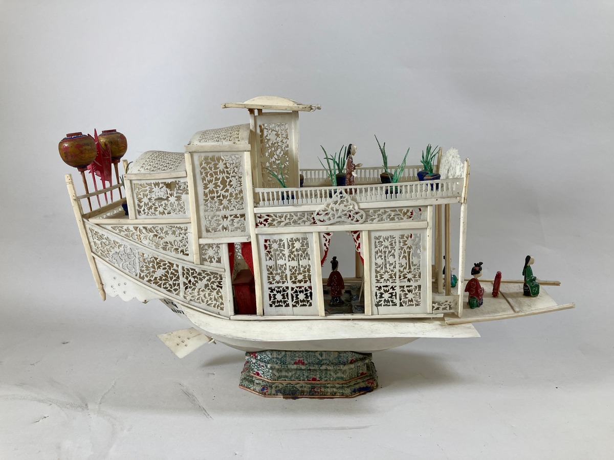Båtmodell, elfenben, ben. Kina. Ca 1800.; Modell av en s.k. “blomsterbåt” eller “nöjesdjonk”. Utförd i fint utarbetat genombrutet arbete och försedd med rikt skurna detaljer. Båten har dekorerats med lanternor, flaggor mm. samt inredning med möbler, lyktor, krukväxter, samt ett antal figurer. Delvis utfört i färgat elfenben. Ursprungligen har dekoren varit mer omfattande flera delar och figurer saknas.