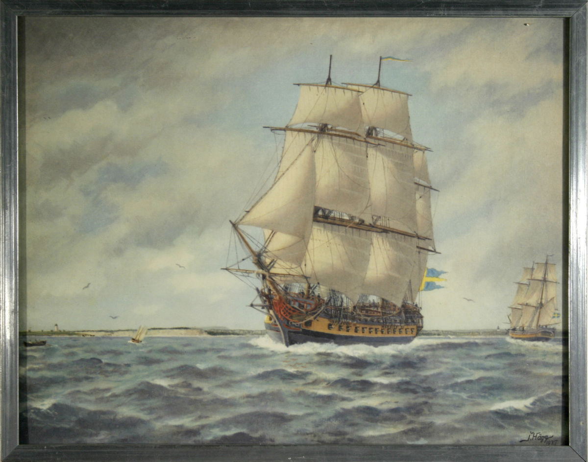 WASA, ostindiefararen vid Östergarn, 68-kanoners skepp. Byggd i Kalskrona 1778. Rederi, Kungliga Svenska Marinen. Såld 1803 till Ostindiska Kompaniet. Färglagd färgreproduktion av amiral J Häggs målning.