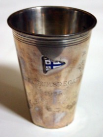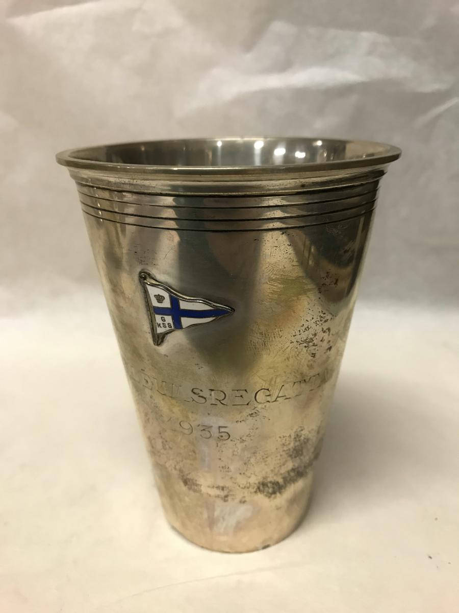Seglarpris. Pokalen vunnen av västkustseglaren och bogserbåtsskepparen i Göteborg Oskar Axelsson.