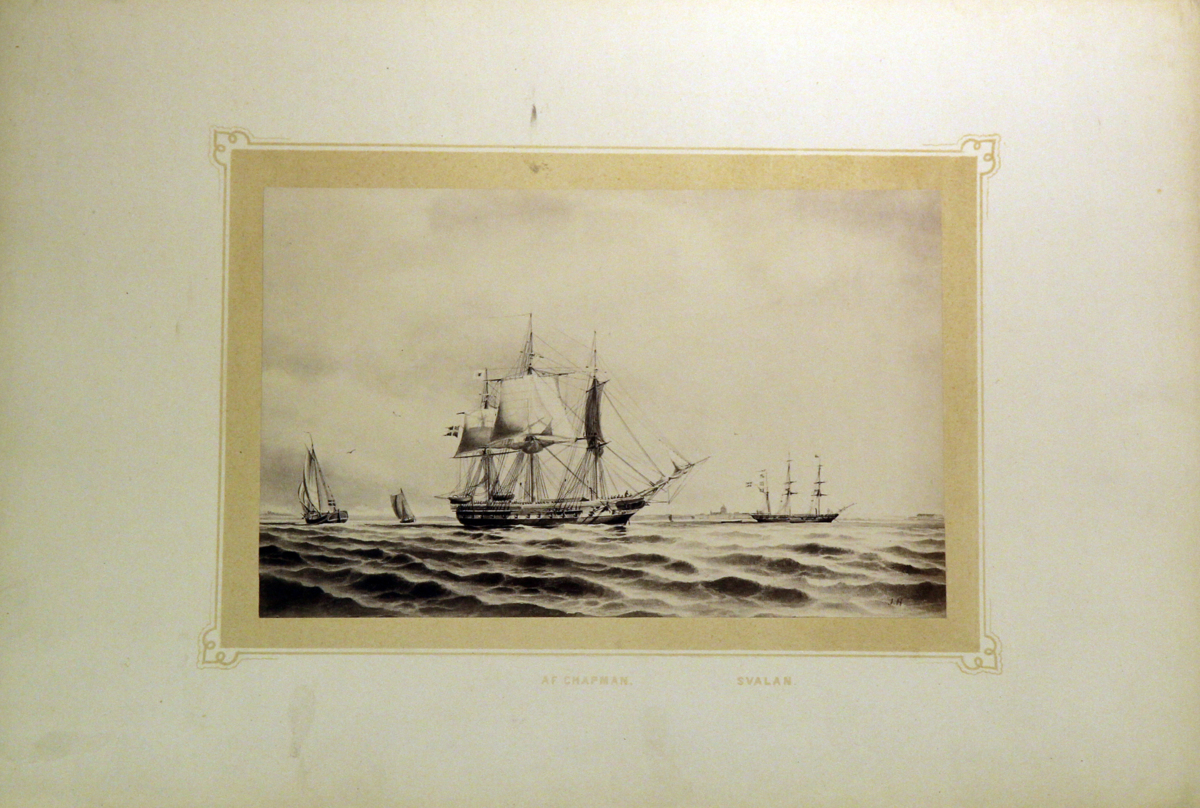 'Af CHAPMAN' 36 kan. fregatt b. i Karlskrona 1830. Kungl. Svenska Marinen. 1854-55 omändrad till korvett. 1876 K. Br. Bestämde att hon endast skulle nödtorftigt underhållas. Fotot visar en sepialavering av J.Hägg och föreställer 'Af Chapman' omkring 1870. Laveringen förvarad i Sjöhistoriska Museet i Stockholm. 'SVALAN' korvett byggd i Motala 1845. Kungl. Svenska Marinen. Ursprungligen byggd såsom segelbrigg och var vår flottas första järnfartyg. 1871 slopat.