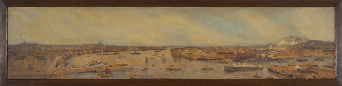 Motivet är en vy (panorama) över Göteborgs hamn. Målningen ska ha tillkommit år 1913 enligt signering på tavlan. Detta bör stämma då tavlan förekommer på gamla fotografier från Sjöfartsmuseet då det huserade i lokaler på Skeppsbron, vilket var på 1910-talet.