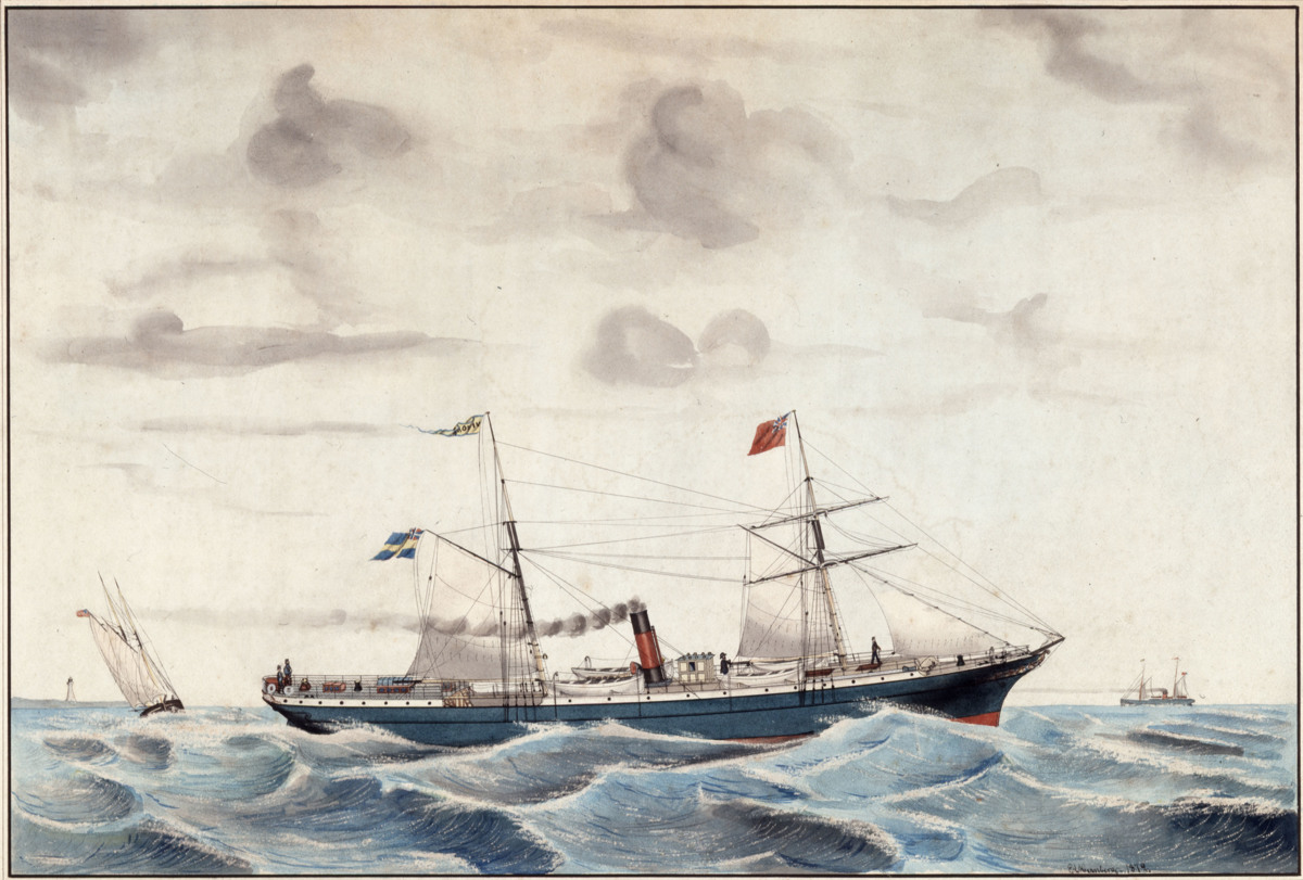 Fartyg till havs, sett från styrbodsida. Det är höga vågor och flera fartyg och segelbåtar avbildade kring fartyget som går för ångmaskin och segel.