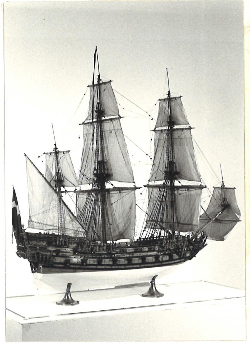Modell i skala 1:12 av AMARANTHE, ett 50-kanoners linjeskepp byggt på Skeppsholmen i Stockholm av Gerdt Croon 1653. Modellen tillverkades 1920-23 under Jacob Häggs överinseende.