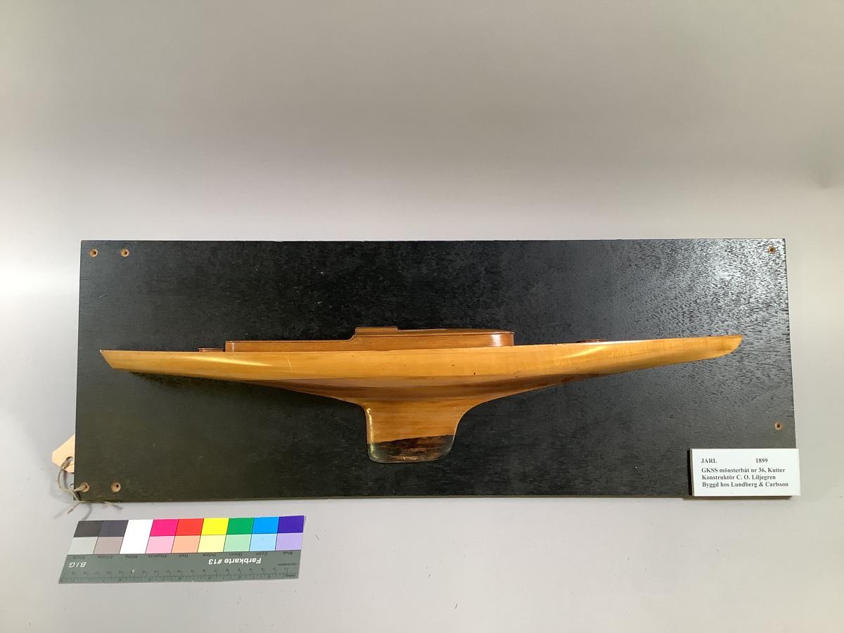 Halvmodell av G.K.S.S. Mönsterbåt JARL (1899) No 36. Konstruktör: C O Liljegren. l.ö.a. 11,60 l.v.l. 7.80 seg. area. 64,62. Monterad på svartmålad träplatta