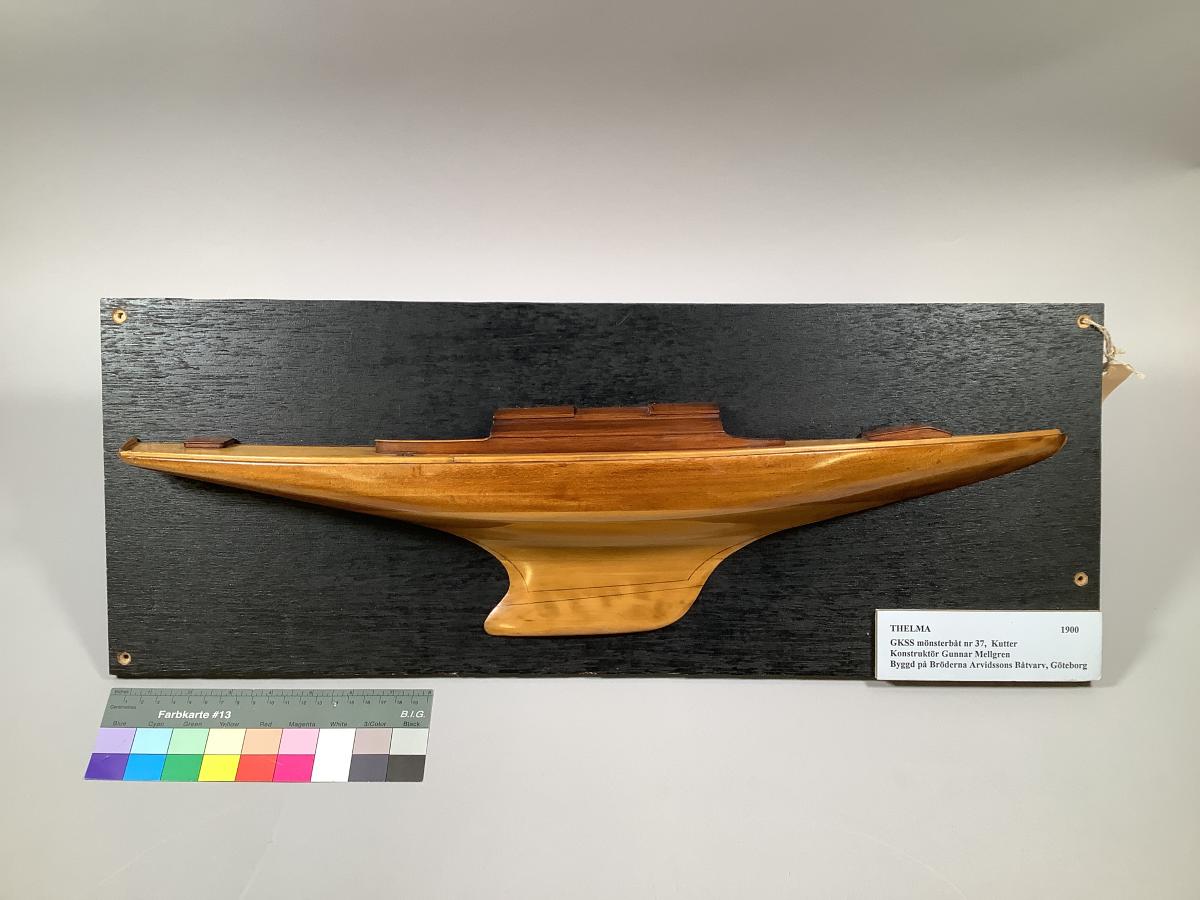 Modellen har skrov lackerad björk. THELMA (1900) G.K.S.S. Mönsterbåt Nr 37. Konstruktör: Gunnar Mellgren. l.ö.a. 11,65 l.v.l. 7,44 seg. area. 94,63. Monterad på svartmålad träplatta