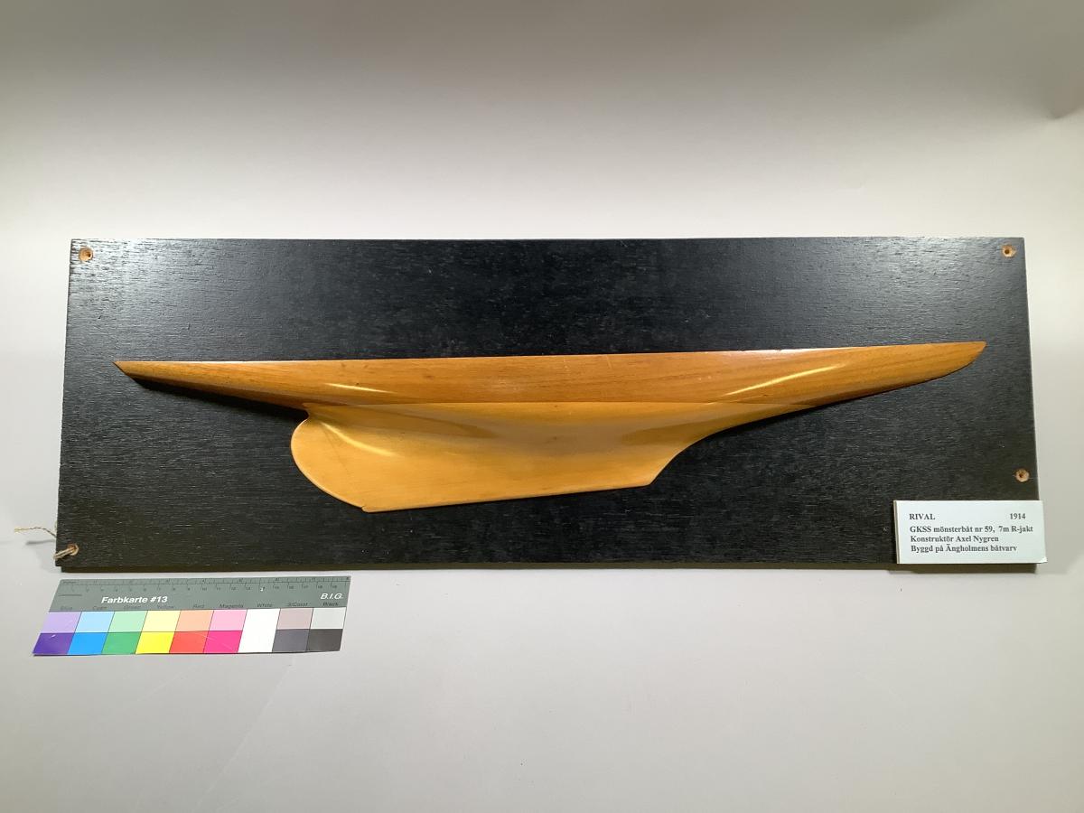 Halvmodell i trä skrov av lackerad björk. G.K.S.S. Mönsterbåt Nr 59. Konstruktör: Axel Nygren. l.ö.a. 12,54 l.v.l. 7,30 seg. area. 82,30.