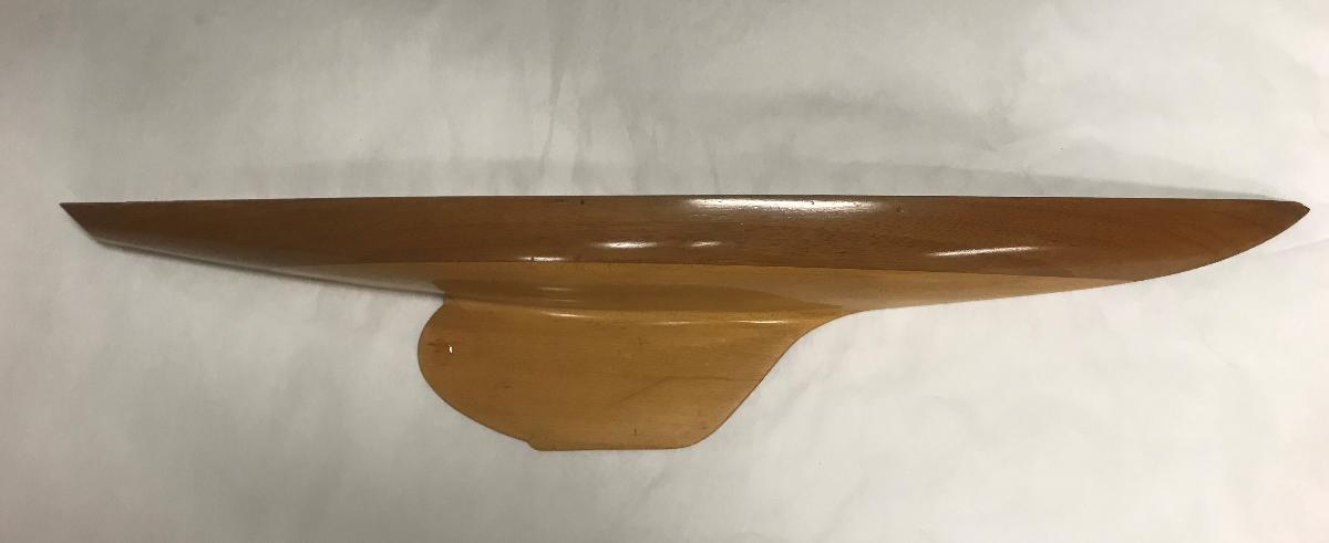 Modell i trä skrov lackerad björk. Konstruktör: T Herlin. l.ö.a. 9,32 l.v.l. 6,30 seg. area. 30,00.