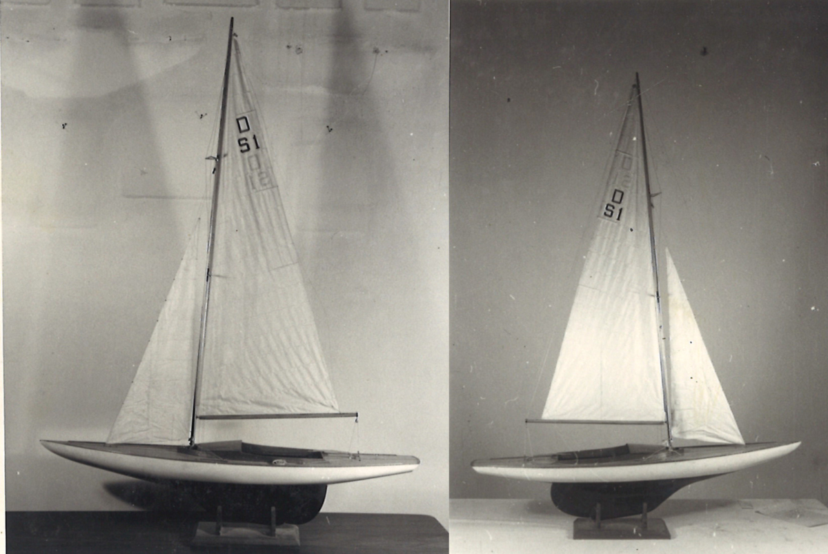 Helmodell med segel, skrov vitmålat, botten svart, däck gult, sittlåda och ruff. Segel märkt D S 1.