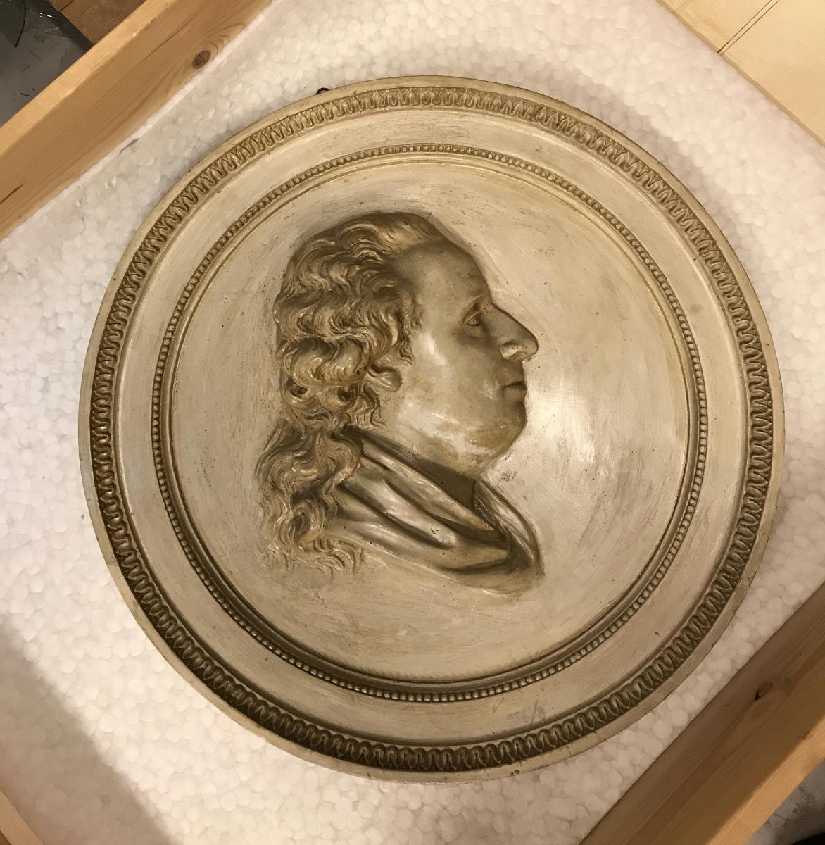 Portträttmedaljong föreställande Francis Sheldon. Motiv av bildhuggaren Erik Cainberg. Gipskopia efter original på Marinförvaltningen, Stockholm.