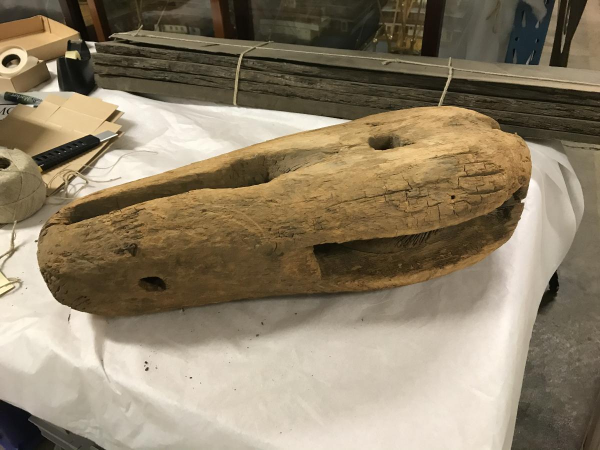 För märseskot och underå toppläntor. Original. Blocket, som uppmuddrats i Göteborgs hamn, har tillhört därstädes år 1644 sänkta danska fartyg.