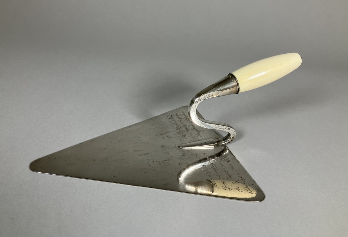 Påskrift: Användes vid grundstensläggningen för Sjöfartsmuseet i Göteborg 4/2 1931 av Ann-Ida Broström f. Mark, Elin Janson f. Broström, Karin Jacobsson f. Broström.