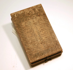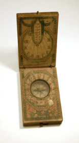 Vikbart solur av trä. Ovansida och insida klätt med papper. Kompass med kompassros infälld i bottenplattan. Insidan klädd med papper med koppartryckt dekor som handkolorerats.