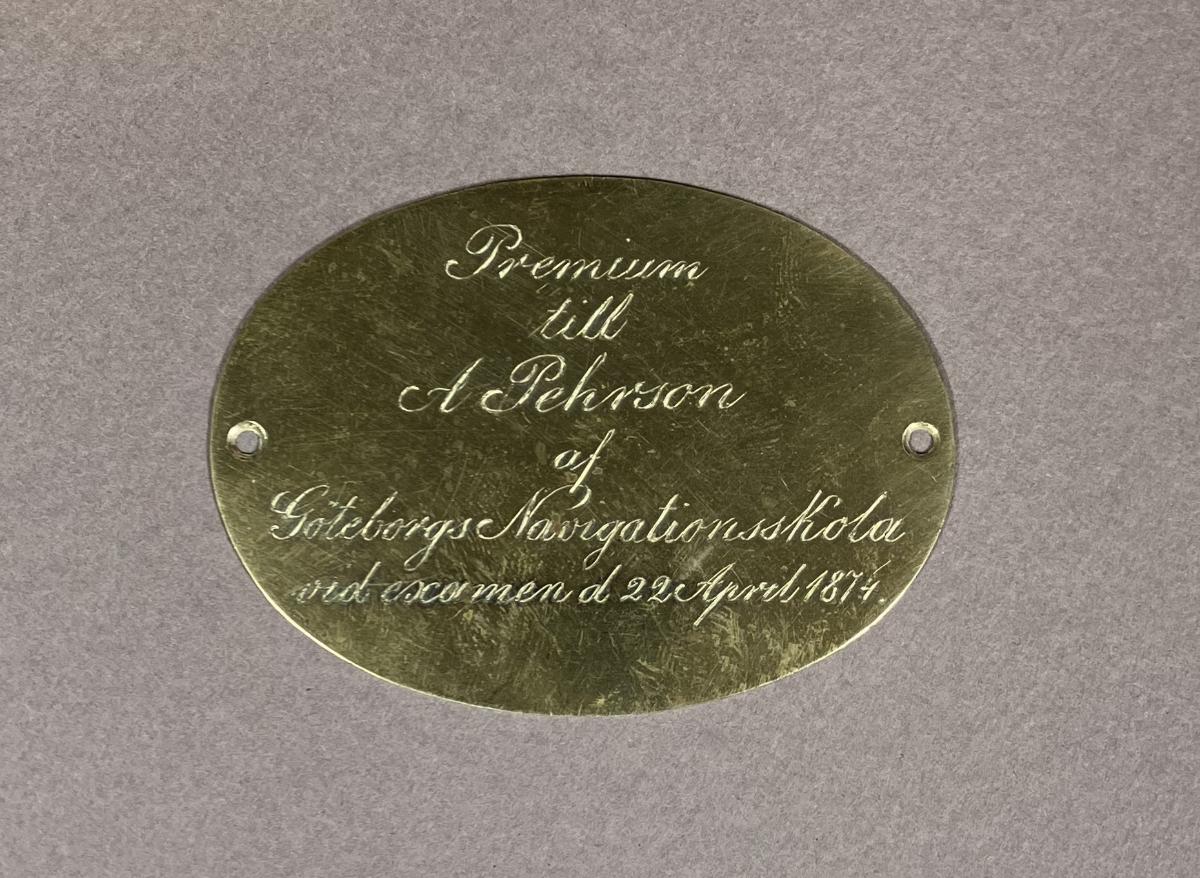 Från Göteborgs Navigationsskola. 'Premium till A Pehrsson af Göteborgs Navigationsskola vid examen d 22 April 1874'.