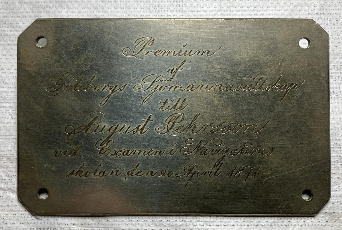 Från Göteborgs Navigationsskola. 'Premium af Göteborgs Sjömannasällskap till August Pehrsson vid examen i Navigationsskolan den 20 April 1871'.