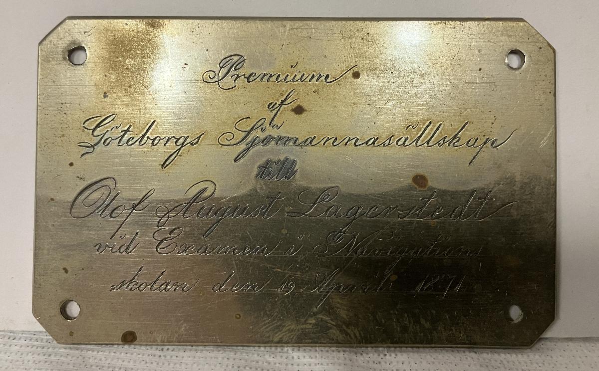Från Göteborgs Navigationsskola. 'Premium af Göteborgs Sjömannasällskap till Olof August Lagerstedt vid examen i Navigationsskolan den 19 April 1871'.