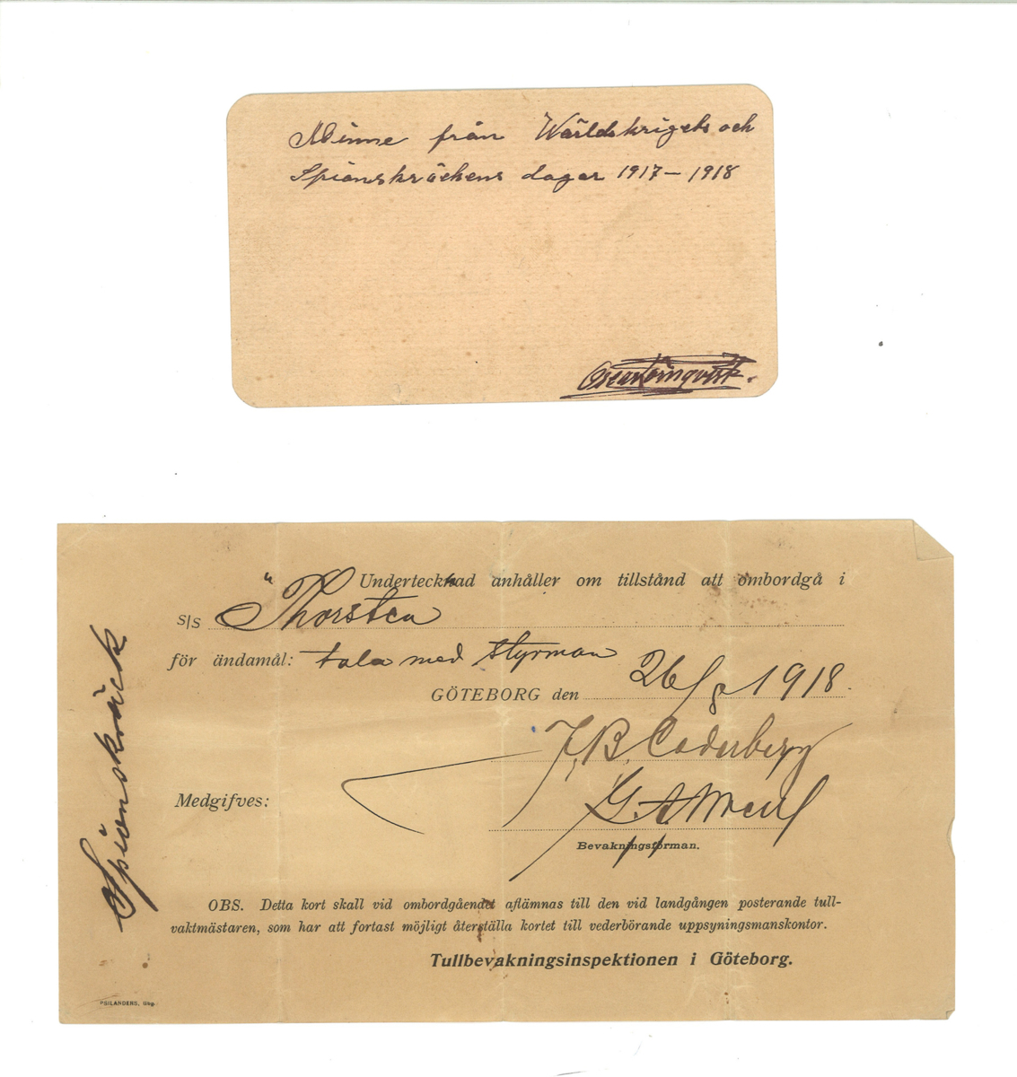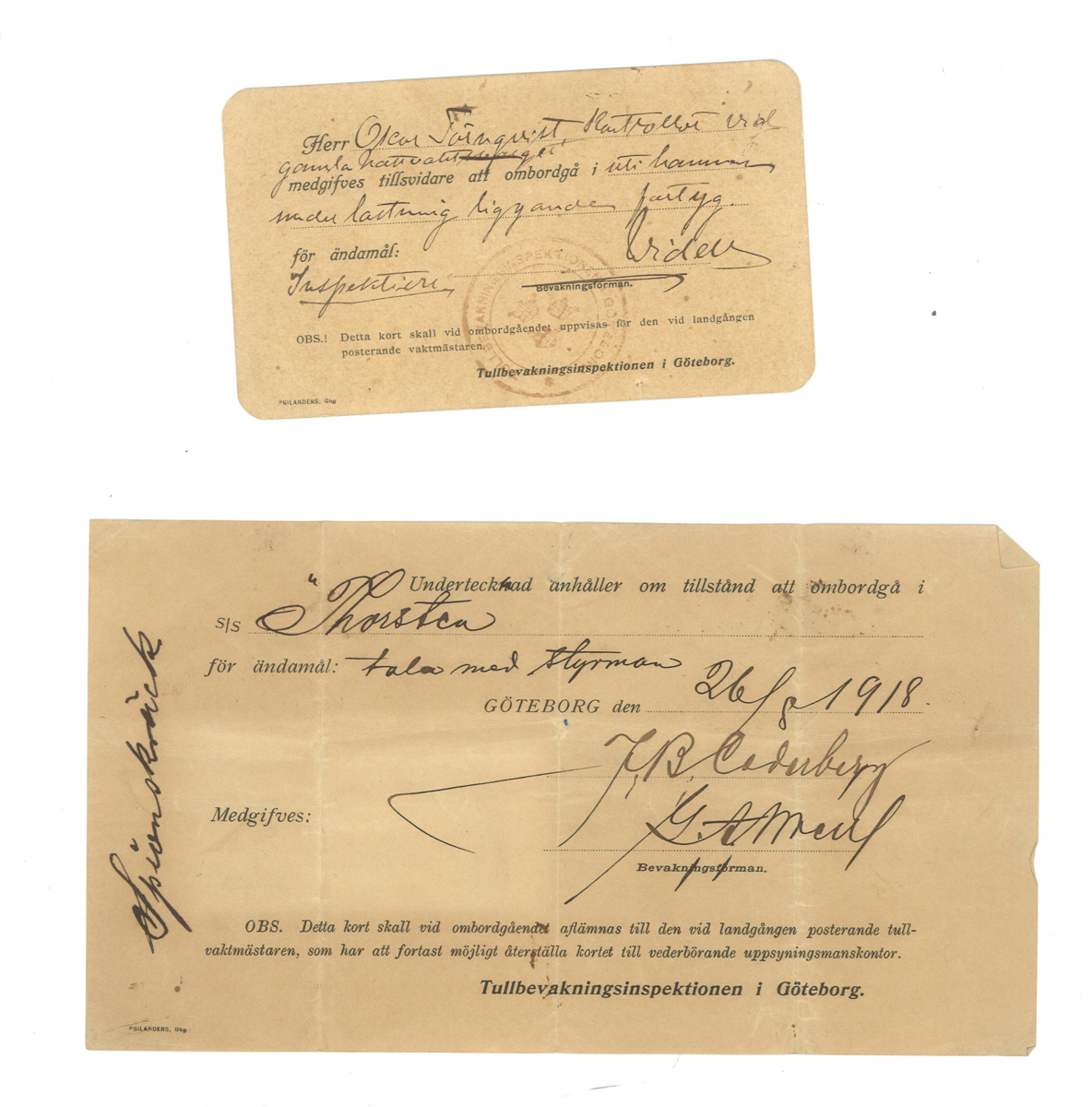 Anhållan är skriven av kapten JB Cederberg (samma Cederberg som var förste tillsyningsman och "förevisare" på Sjöfartsmuseet?) och utfärdad av tullbevakningsinspektionen i Göteborg 26 augusti 1918. Den gäller ett besök på ångaren THORSTEN i Göteborgs hamn, för att tala med styrman.