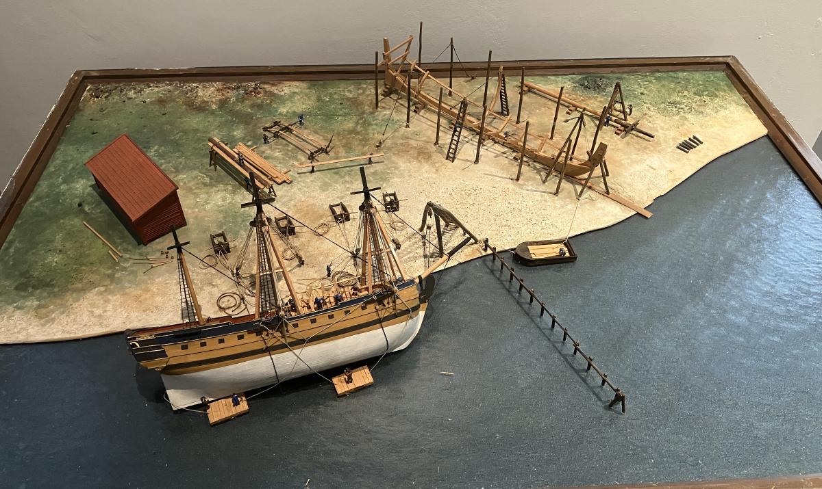 Modell föreställande äldre skeppsbyggeri varv från 1700-talet med ett fartyg under byggnad, samt ett kölhalat fartyg.