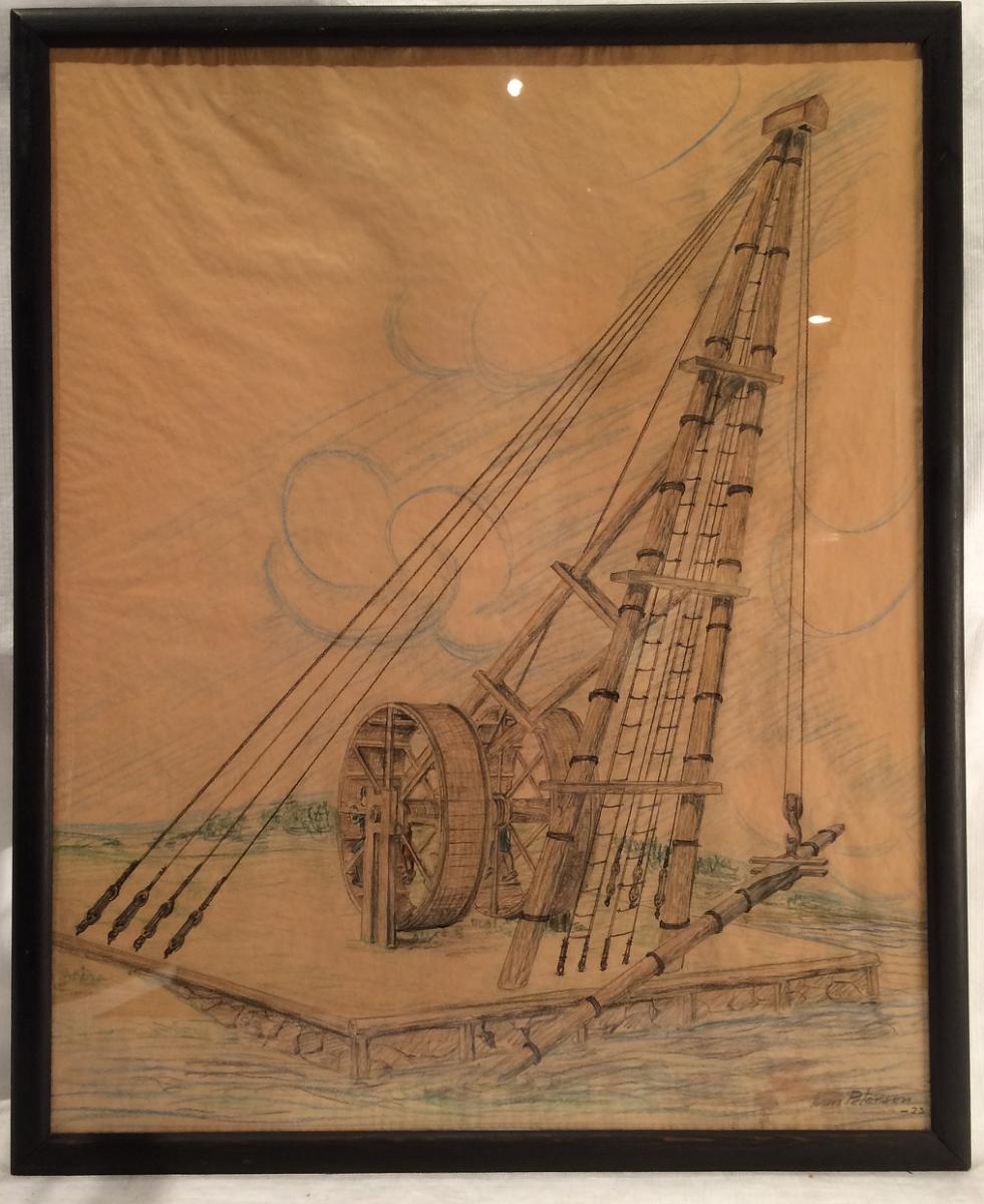 Blyertsteckning mastkran med tramphjul från 1700-talet