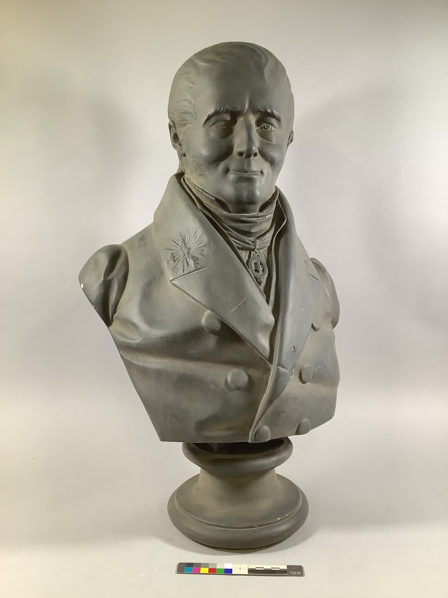 Mörkmålad byst föreställande Samuel Owen. Owen är modellerad i Kungliga Vetenskapsakademiens uniform samt den gamla Vasaordens äldre riddartecken om halsen.