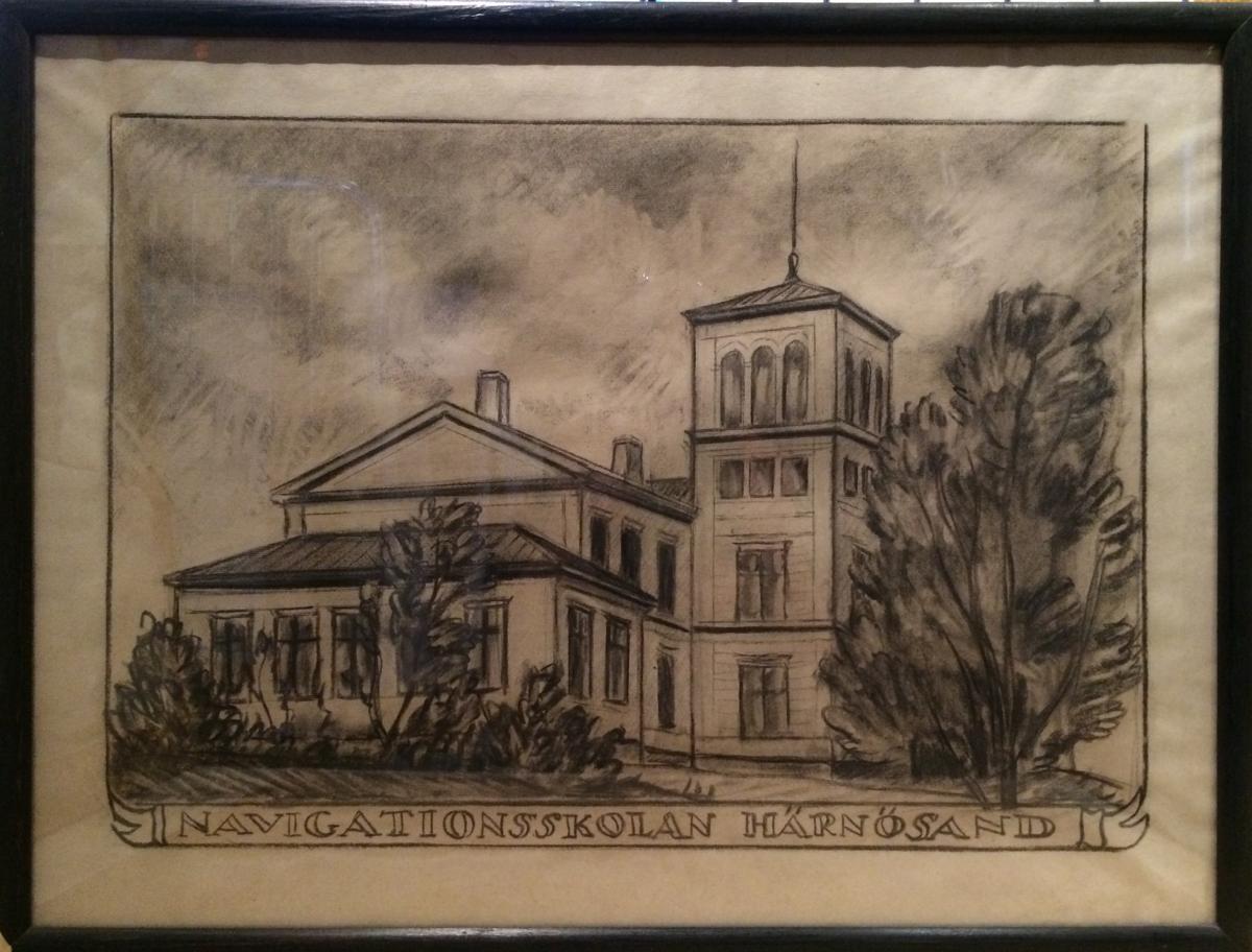 Utvisande Navigationsskolan i Härnösand i bakgrunden och träd i förgrunden.
