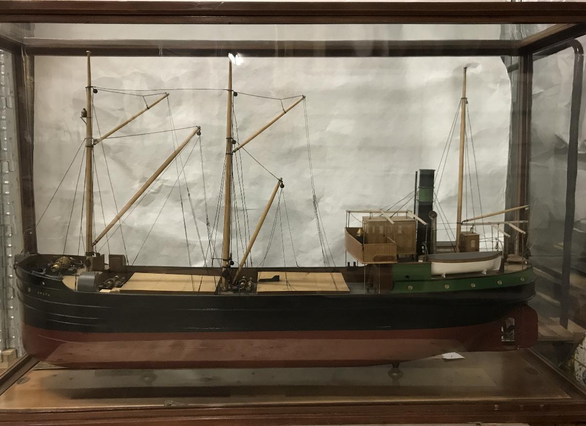Fartygsmodell i monter, Kanalångaren S/S GRETA. Byggd 1914 på Eriksbergs Mekaniska verkstad, Göteborg.