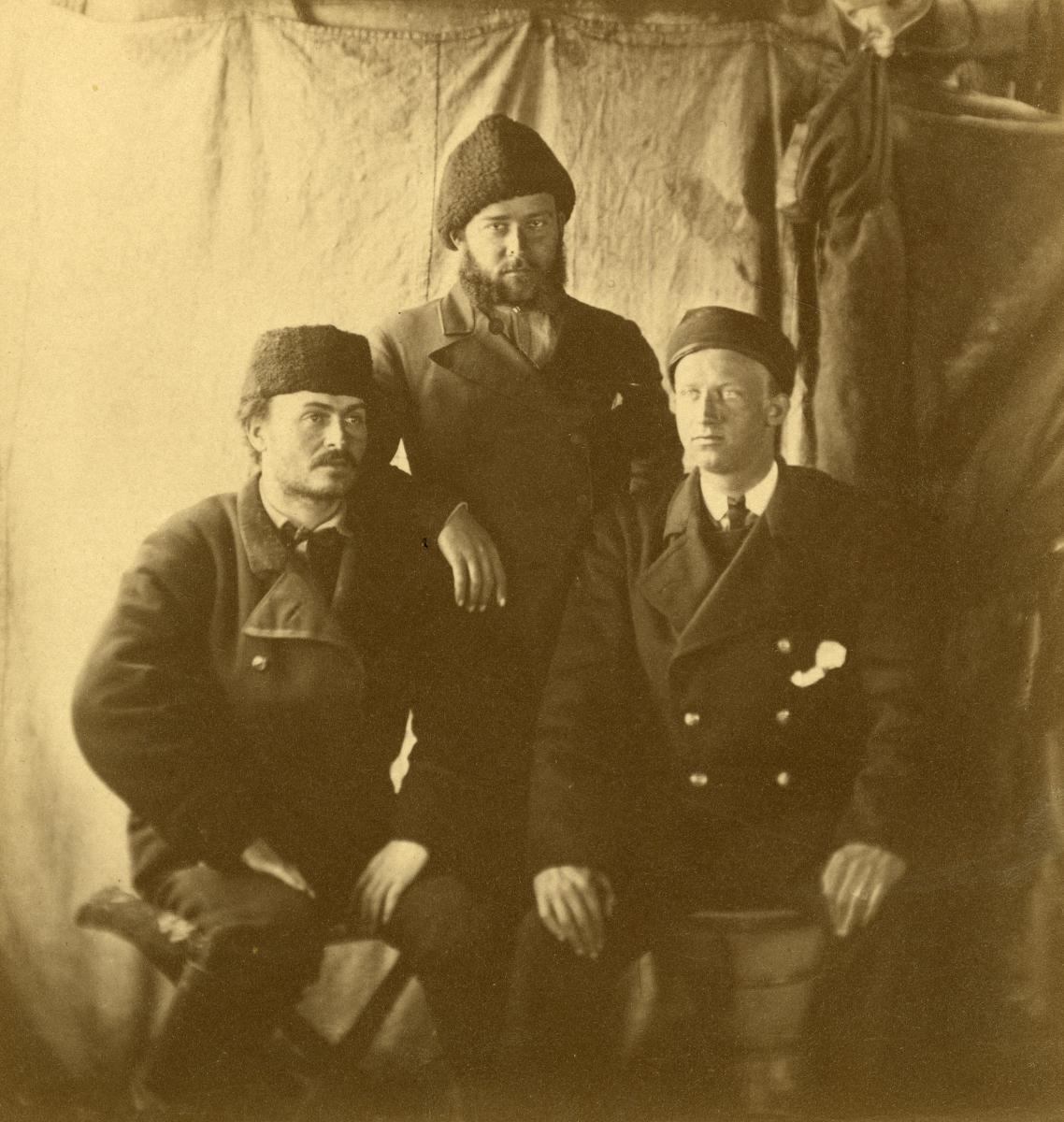 Fotografi som visar Nordqvist, Stuxberg och Hovgaard fotograferade i VEGAs vinterkvarter 1879.