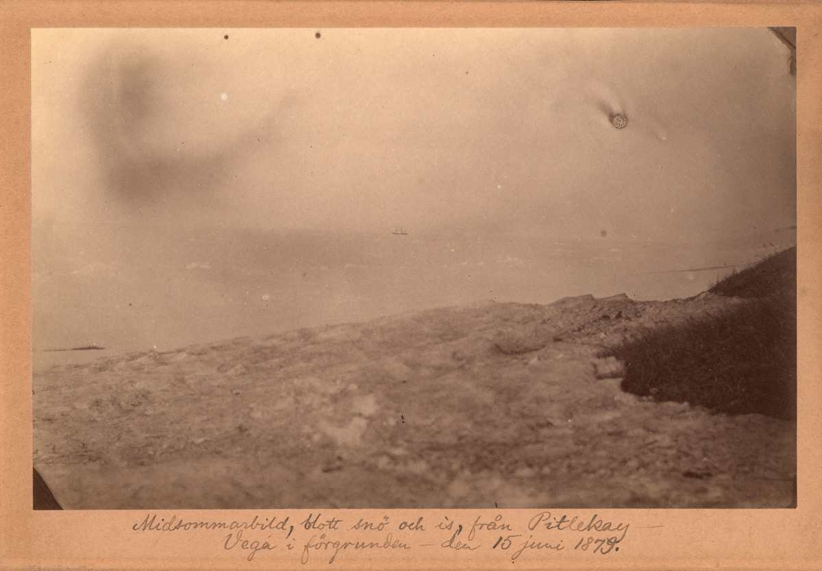 Fotografi från VEGAs resa genom Nordostpassagen 1878-1880. Föreställer VEGA i förgrunden på en midsommarbild, tagen 15 juni 1879, med snö och is, sett fran Pitlekaj,
