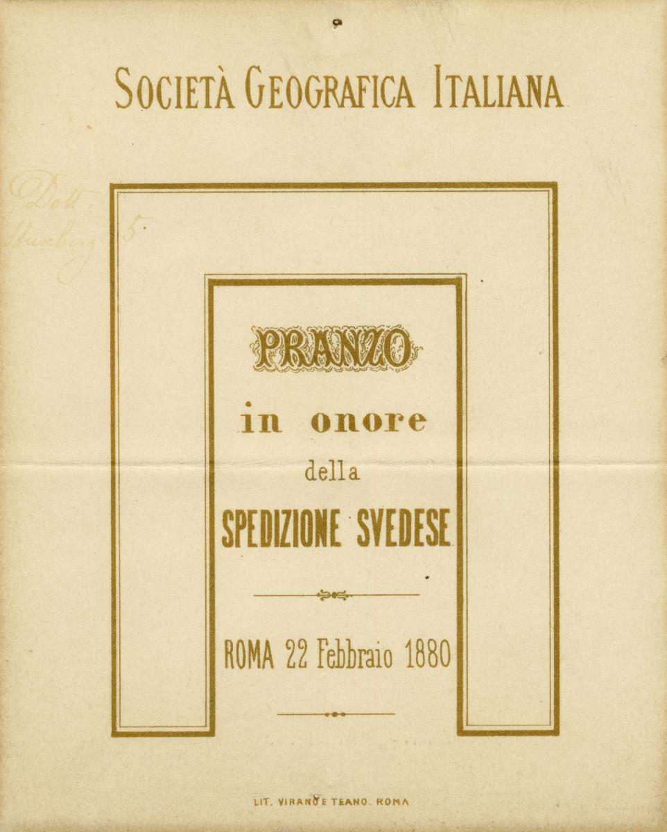 Inbjudningskortet, som tillhört Stuxberg, är från den 22 februari då expeditionens medlemmar först deltog i ett möte med det Italienska geografiska sällskapet (Societa Geografica Italiana), vilka delade ut sin stora guldmedalj till Nordenskiöld. På kvällen följde en festmiddag på Contiental Hotel vilket sällskapet ordnade i Vegas ära.