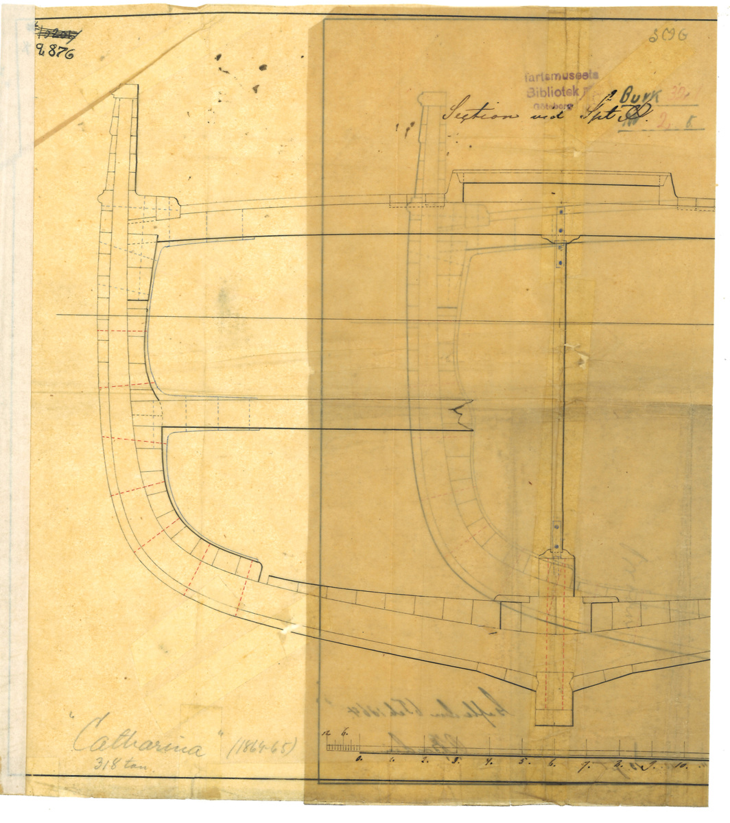 Tuschkopia av ritning, signerad O. Brodin, Gefle 1864. Visar sannolikt fartyget CATHARINA