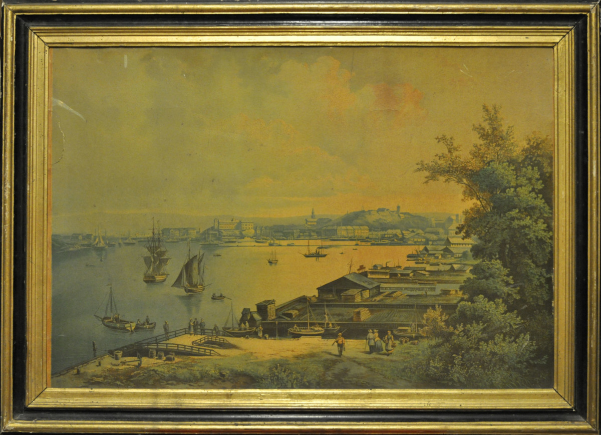 Lackertat oljetryck över Göteborgs Hamn ca 1850.