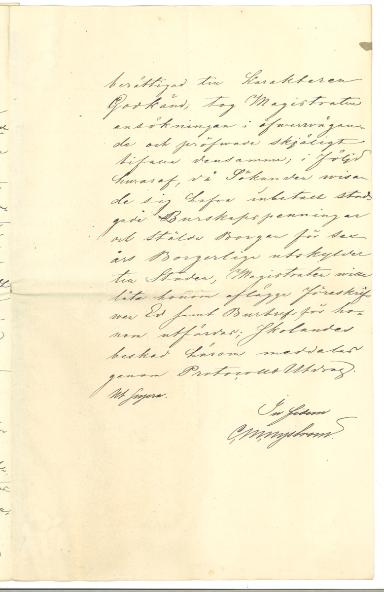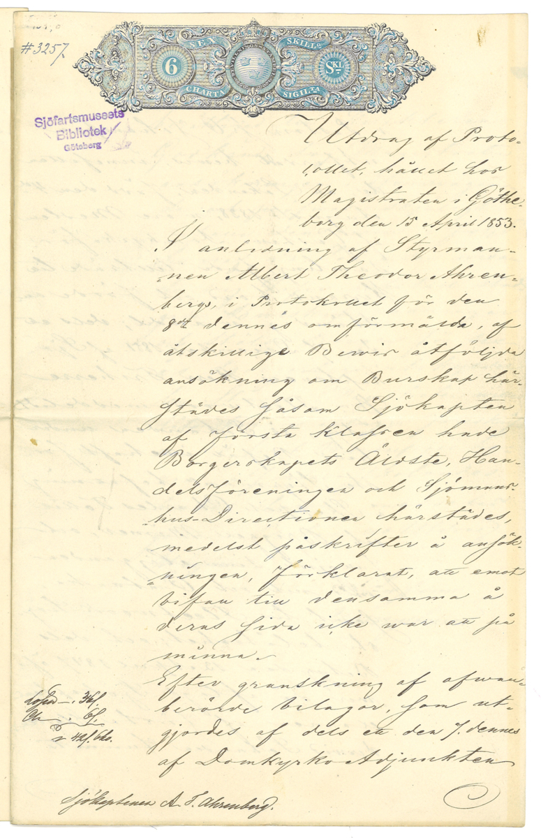 Protokollsutdrag från magistratsasammanträde varvid burbrevet för kapten Ahrenberg utfärdades. Samtidigt utfärdades burbrev (SMG3256).