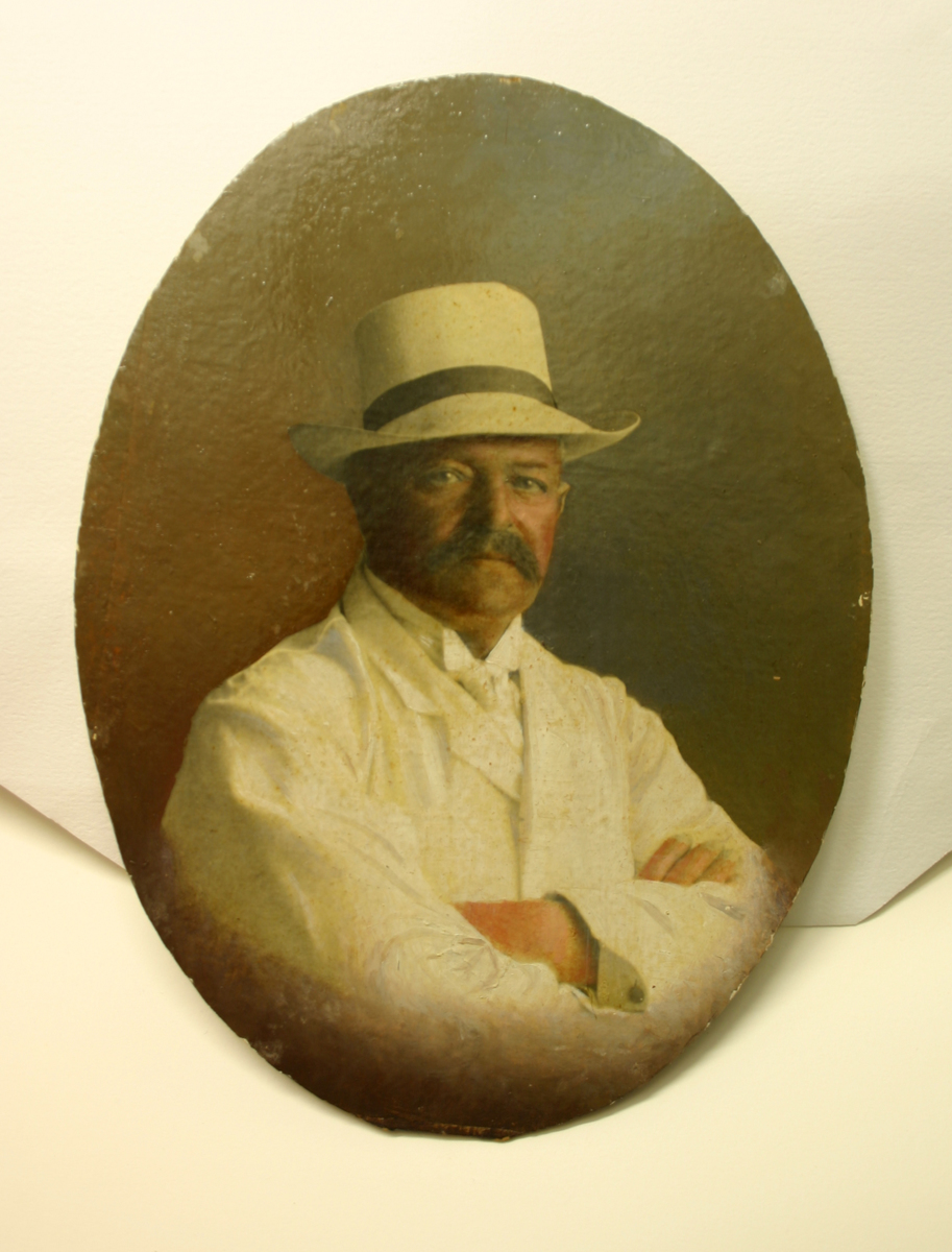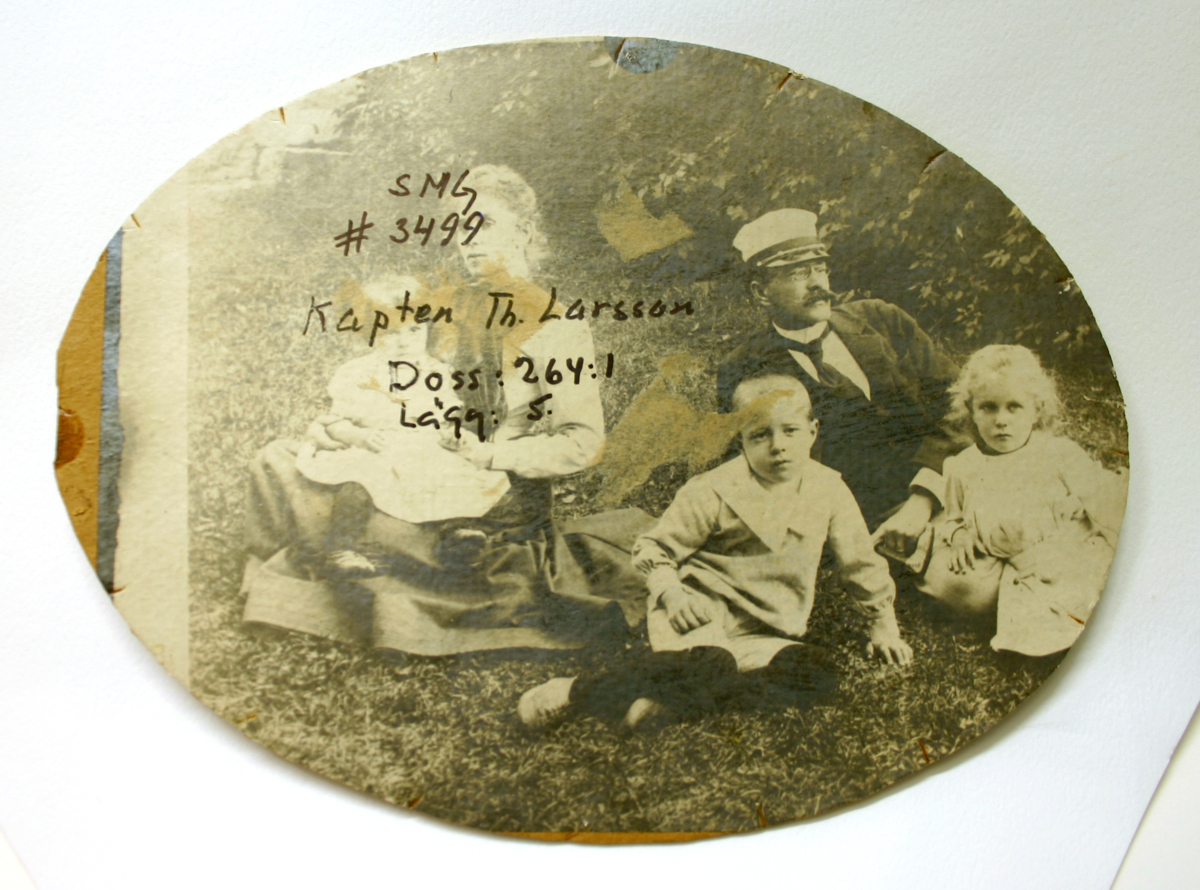 Ovalt färglagt fotoporträtt föreställande kapten Thorsten Larsson som är uppklistrad på en kartong. På baksidan av kartongen finns ett svartvitt fotografi som troligtvis föreställer familjen Larsson, kapten Larson hans fru och tre barn, sittandes i gröngräset. Porträttet har varit inramat.