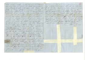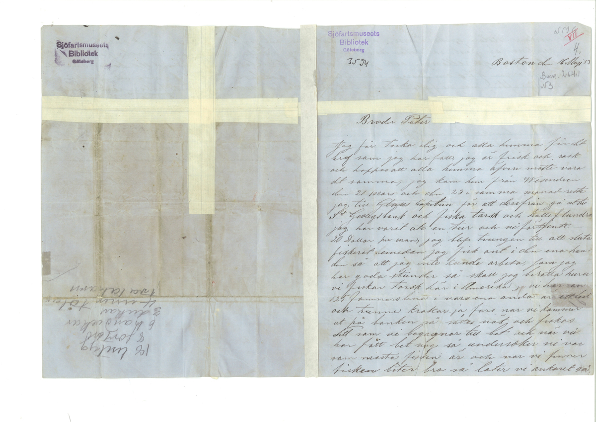 Handskrivet brev på ljusblått papper från kapten Larssons bror Axel 16/5 1853.
