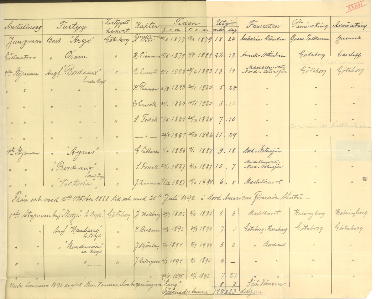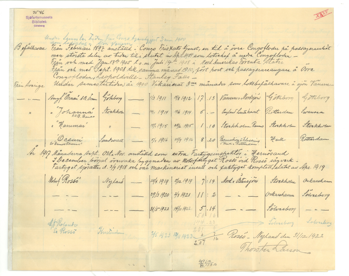 En förteckning över vilka arbeten Thorsten Larsson har haft. Med i förteckningen finns tider, platser och fartyg.