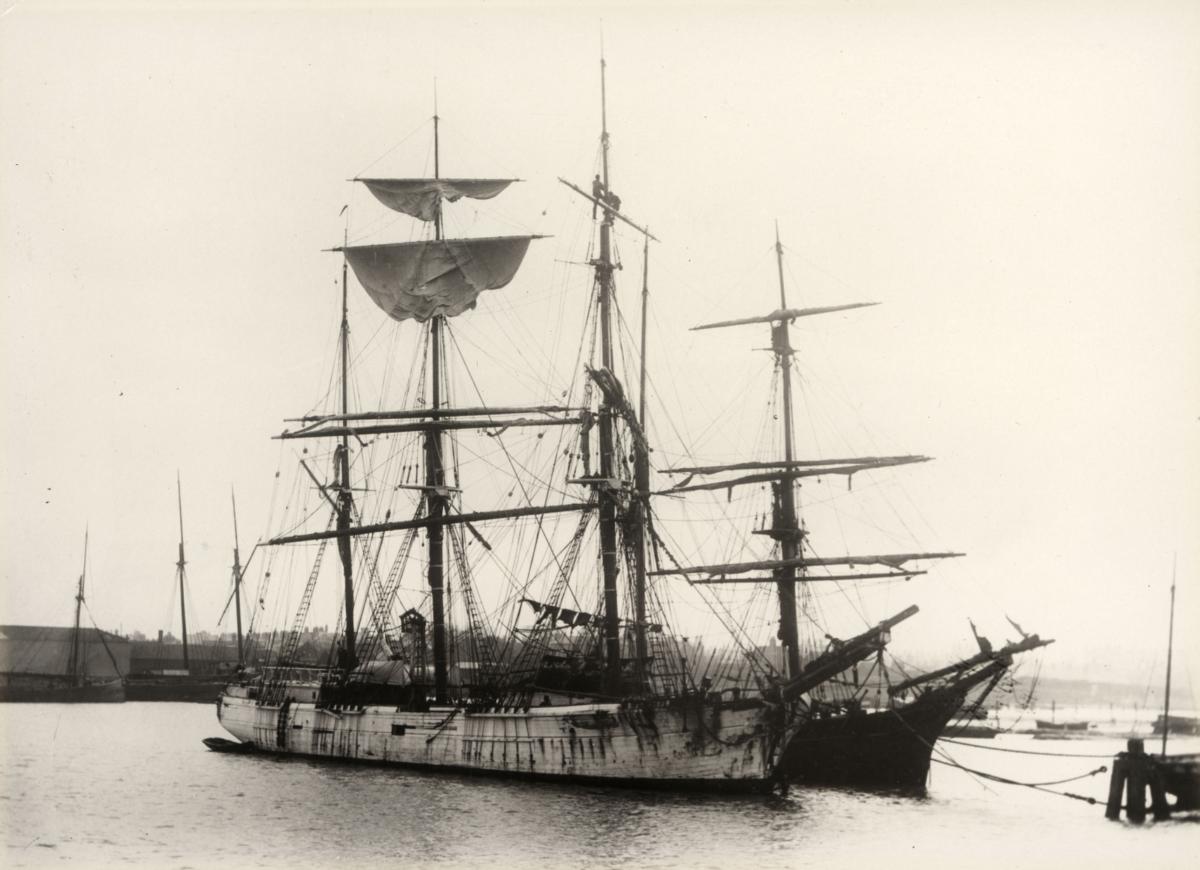 Fartyget ligger i en hamn, förtöjd vid en påle. Ett annat segelfartyg ligger precis bakom. I bakgrunden skymtar fler segelfartyg.
