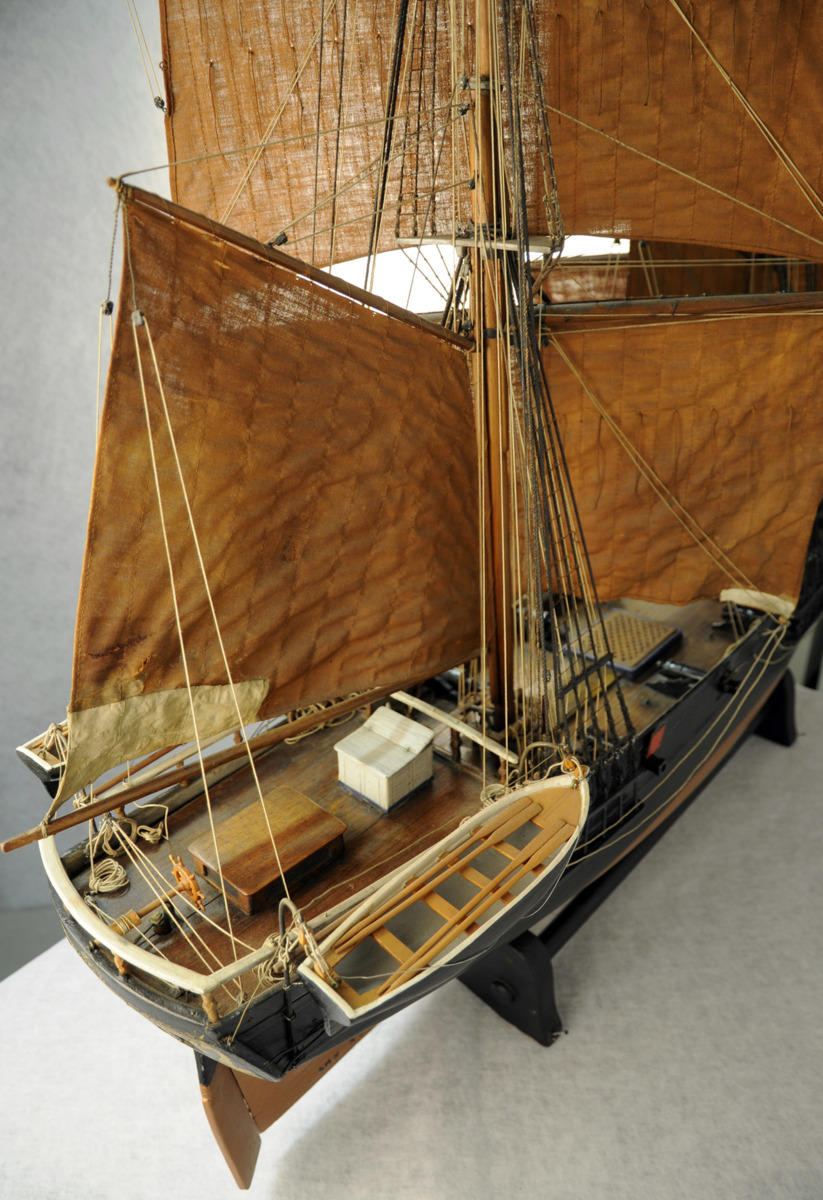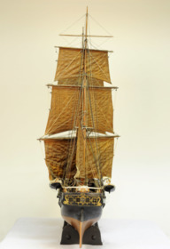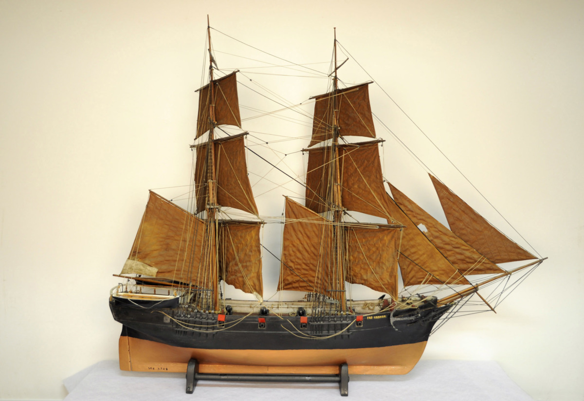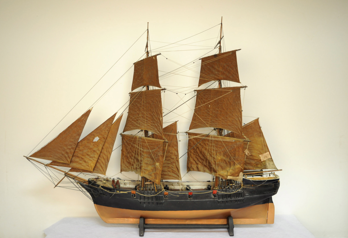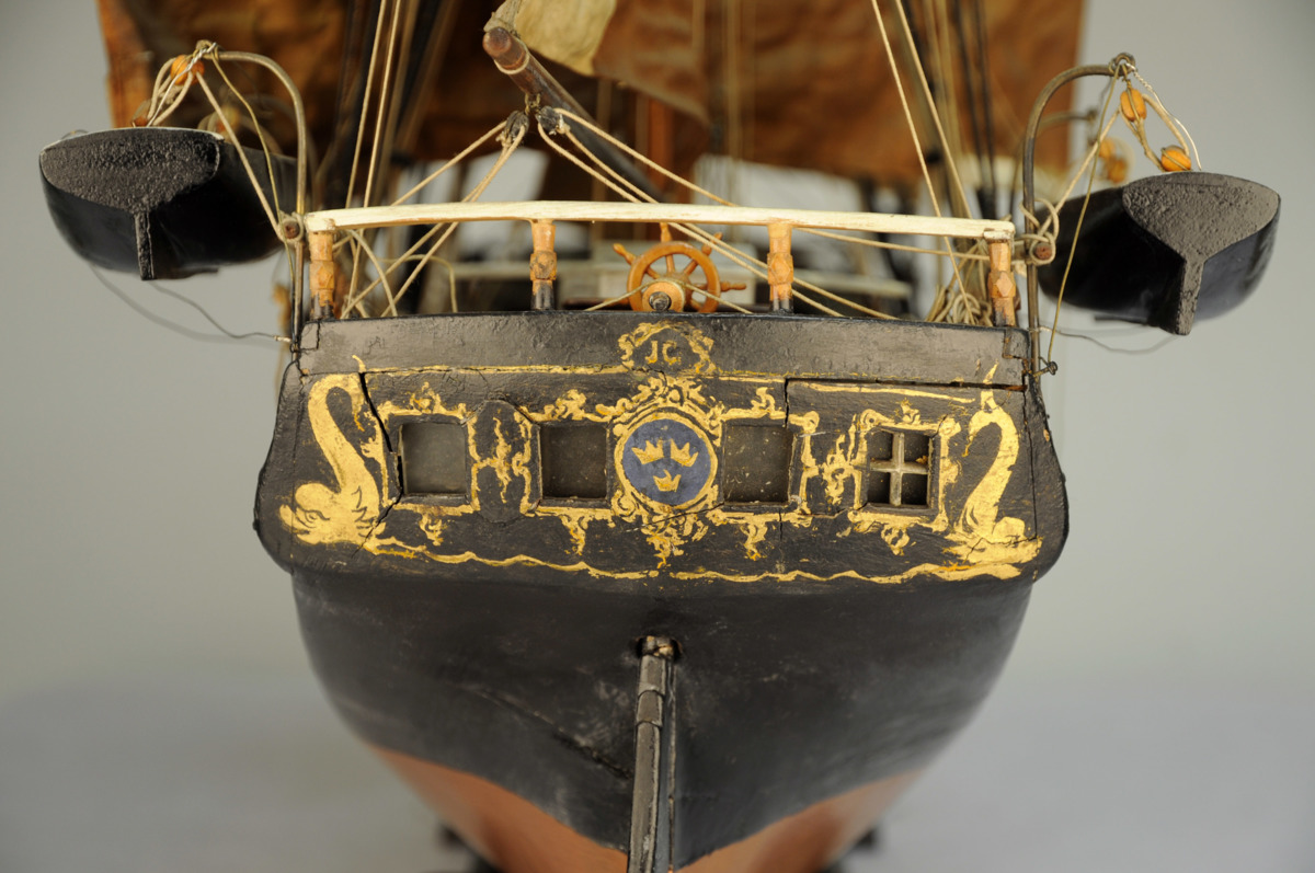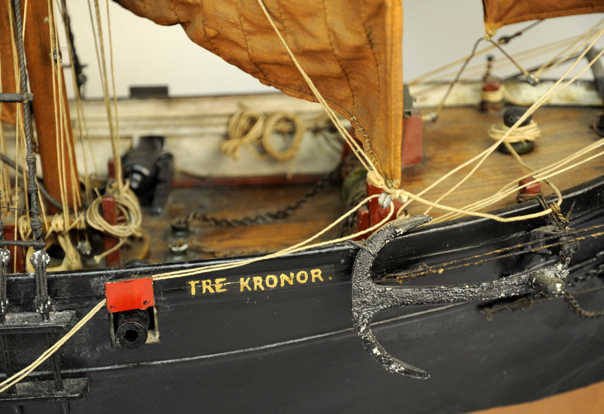 Modell av briggen TRE KRONOR med åtta kanoner på övre däck. Modellen var förebild för briggen CHARLOTTA i Vilhelm Mobergs roman Utvandrarna.