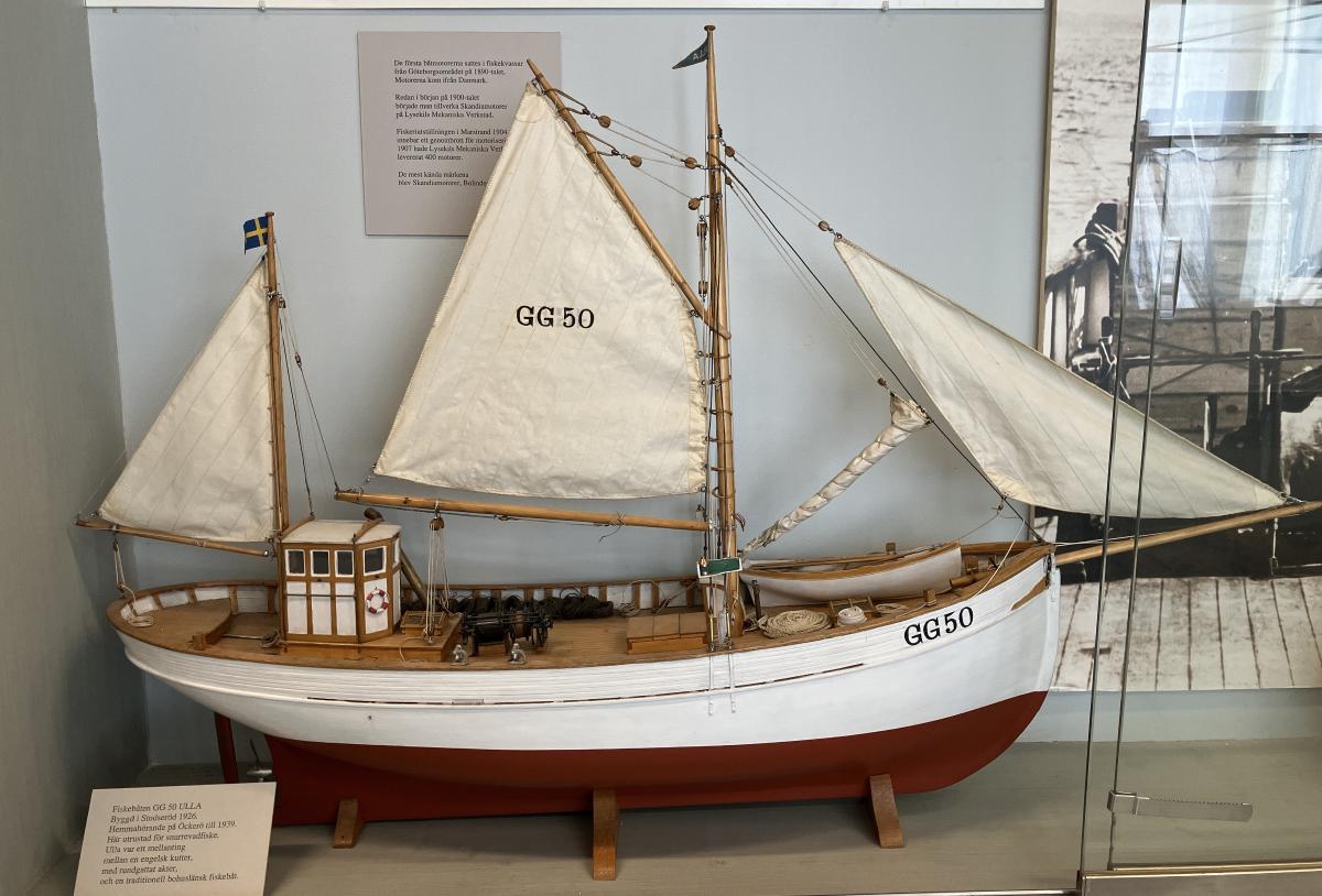 Modell med segel, uppmonterad för snurrevadsfiske. (Från början av 1900-talet.)
