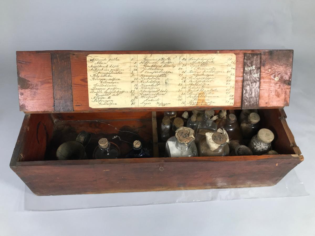 Rektangulär låda av furu med delbart lock där gångjärnen är placerade på lockets mitt. På lockets insida har en lista över medicinska preparat klistrats. Ursprungligen har kistan innehållit minst 47 preparat av vilka endast 33 återstår, flera av dessa flaskor saknar innehåll. Vidare innehåller kistan en liten sked, en mugg med insats, en termometer i fodral, trasiga delar till ett par öron kåpor samt några oidentifierade objekt.