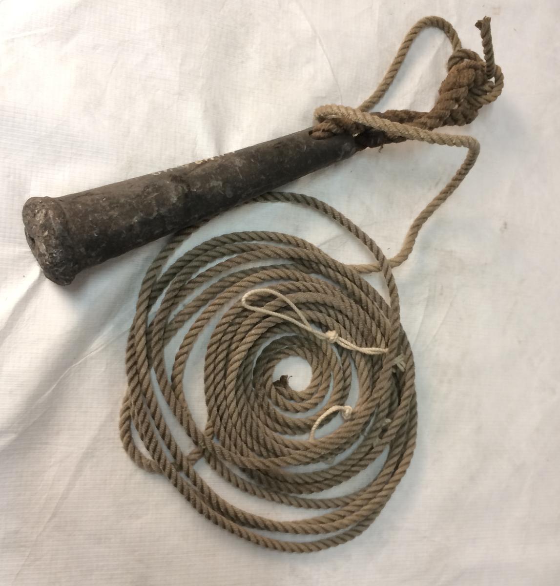 Konformat lod av bly med genomgående hål för lodlina. I hålet ett grövre tvinnat rep i form av en ögla i vilken linan är fäst.