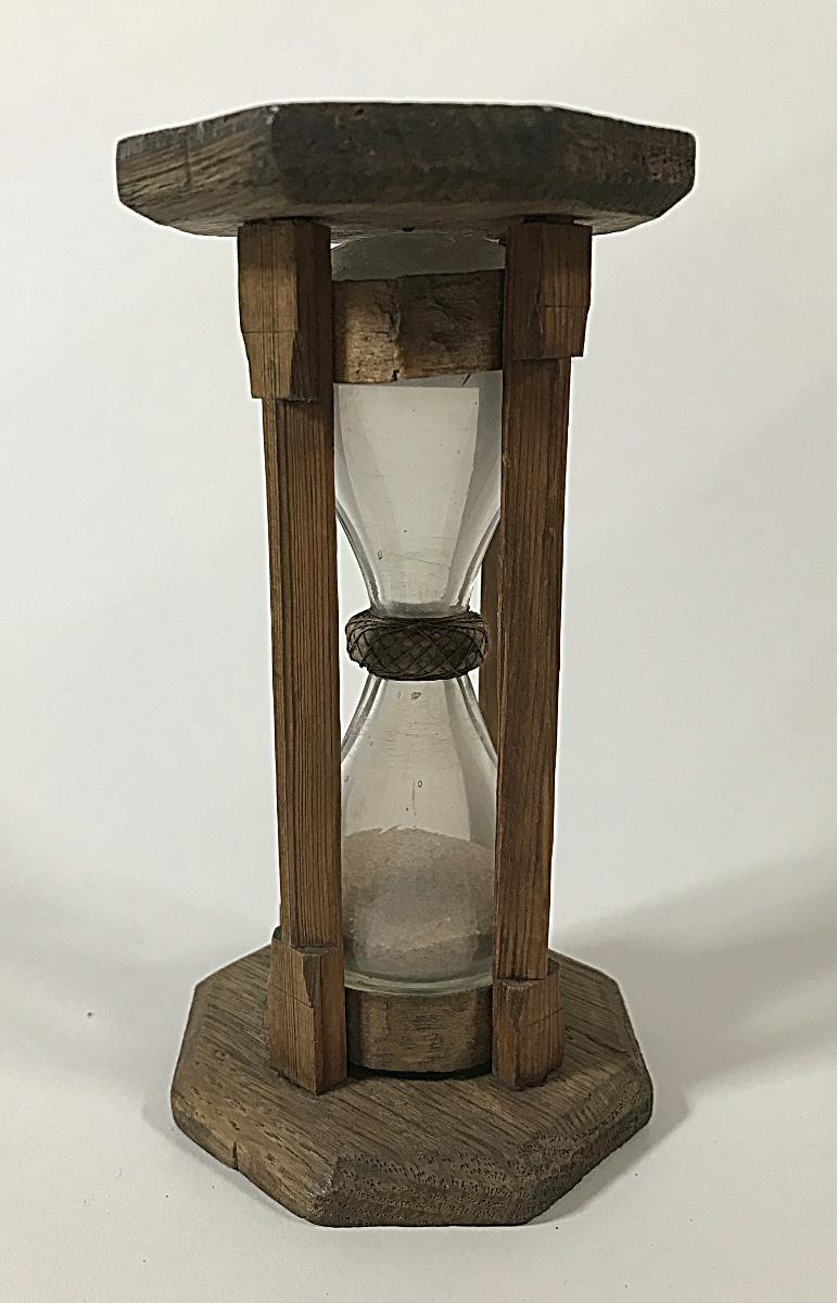28 sekunders logglas i stativ av fur eller gran. Åttakantiga bottnar och fyra pelare med kilformade mittstavar. Två päronformade med spetsar mot varandra ställda glas förenade med en smal hals sammanvirad med textiltråd.Glasen hålls på plats mot bottnarna med tunna träspån, delvis sönderbrutna. Grov, brunsvart sand.