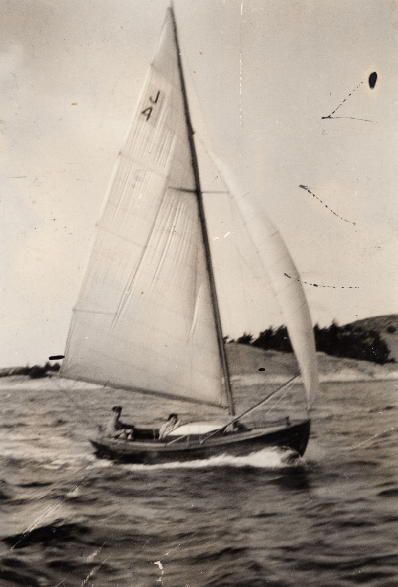 Fotografi, två personer i Sjöscouternas segelbåt