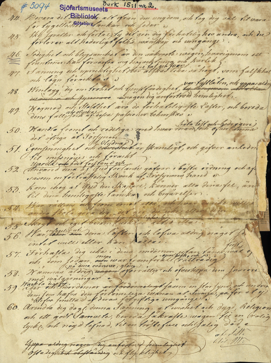 Anteckningar av personlig natur - numrerade och listade förhållningssätt/god råd om hur man bör leva, tro, tänka, tycka